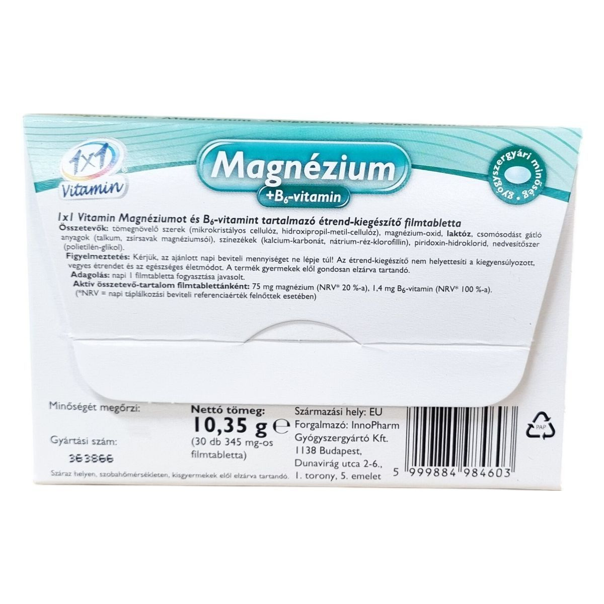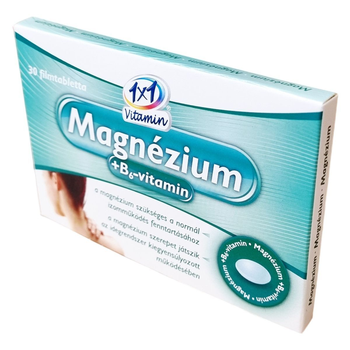 Ez az étrend-kiegészítő filmtabletta magnéziumot és B6-vitamint tartalmaz. A magnézium szükséges lehet a normál izomműködés fenntartásához, és szerepet játszhat az idegrendszer kiegyensúlyozott működésében. A termék gyógyszergyári minőségű, 30 darab 345 mg-os filmtablettát tartalmaz, nettó tömege 10,35 g. Az aktív összetevők mennyisége filmtablettánként 75 mg magnézium, amely a napi táplálkozási beviteli referenciaérték 20%-át, valamint 1,4 mg B6-vitamin, amely az NRV 100%-át jelenti. A készítménykkel szemben javasolt az ajánlott napi mennyiség betartása, és nem helyettesíti a változatos étrendet és az egészséges életmódot.