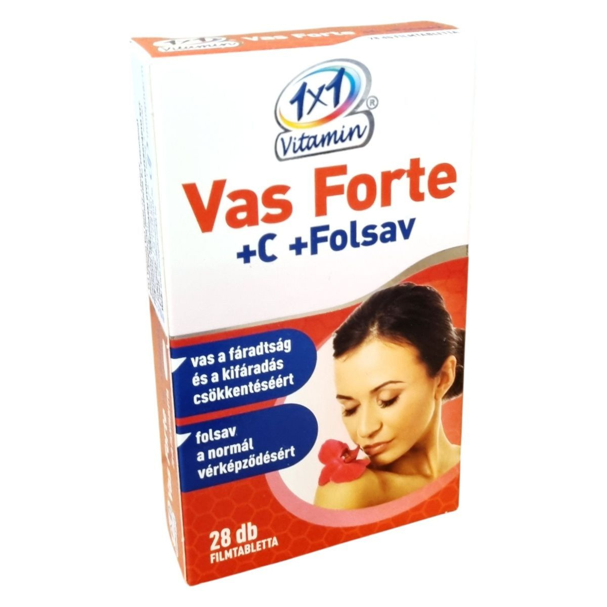 Az 1x1 Vitamin Vas Forte +C +Folsav étrend-kiegészítő filmtabletta vasat, C-vitamint, folsavat és B12-vitamint tartalmaz. Ezek a hatóanyagok együttesen támogathatják a szervezet energiaháztartását és a vérképzést. A vas hozzájárulhat a fáradtság csökkentéséhez, míg a folsav és a B12-vitamin segíthetik a normál vérképződést. A termék napi egy tablettás adagolással könnyen fogyasztható, és ideális választás lehet a fokozott vas- és vitaminigény pótlására. A csomag 28 darab filmtablettát tartalmaz, nettó tömege 14 g. A terméket az Innopharm Gyógyszergyártó Kft. forgalmazza, székhelye Budapest. A filmtabletták szorbitot tartalmaznak, ezért túlzott fogyasztásuk hashajtó hatású lehet.
