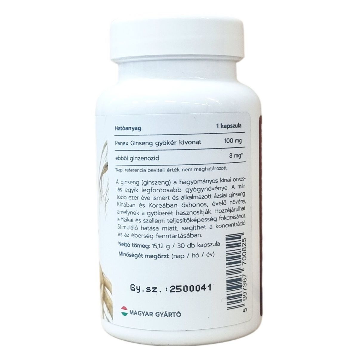 A ginseng, más néven ginszeng, a hagyományos kínai orvoslás egyik legfontosabb gyógynövénye. Egy több ezer éve ismert ázsiai, évelő növény, amelynek Kínában és Koreában őshonos gyökerét használják fel. A készítmény stimuláló hatása miatt segítheti a koncentráció és az éberség fenntartását, valamint hozzájárulhat a fizikai és szellemi teljesítőképesség fokozásához. A kapszula természetes összetevőkből áll, és mentes a laktóztól, cukortól, gluténtől, GMO-tól és titán-dioxidtól. A termék nettó tömege 15,12 g, mely 30 db kapszulát tartalmaz.
