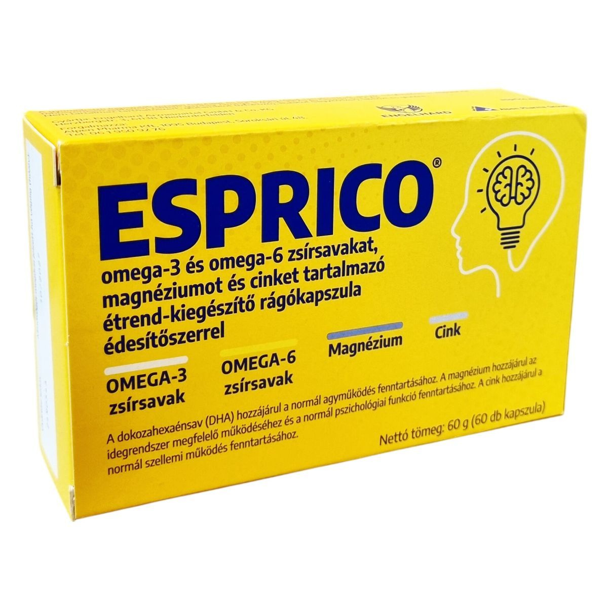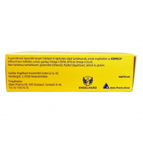 Az ESPRICO® gumírozott kapszulái gyümölcsízűek és többszörösen telítetlen zsírban gazdagok, tartalmaznak omega-3 és omega-6 zsírsavakat, mint a DHA, EPA és GLA. A termék nem tartalmaz tartósítószert, glutamátot, ftalátot, laktózt és glutént. A DHA dokozahexaénsav hozzájárulhat a normál agyműködés fenntartásához, a magnézium pedig az idegrendszer megfelelő működéséhez és a normál pszichológiai funkció fenntartásához. A cink hozzájárulhat a normál szellemi működés fenntartásához. A napi 4 kapszula bevitelével a termék töredékét biztosítja a javasolt 250 mg DHA napi mennyiségnek. Az ESPRICO® fogyasztása során fontos betartani az ajánlott adagolást, és tisztában lenni az allergén összetevőkkel, különösen hal és szójaallergia esetén.