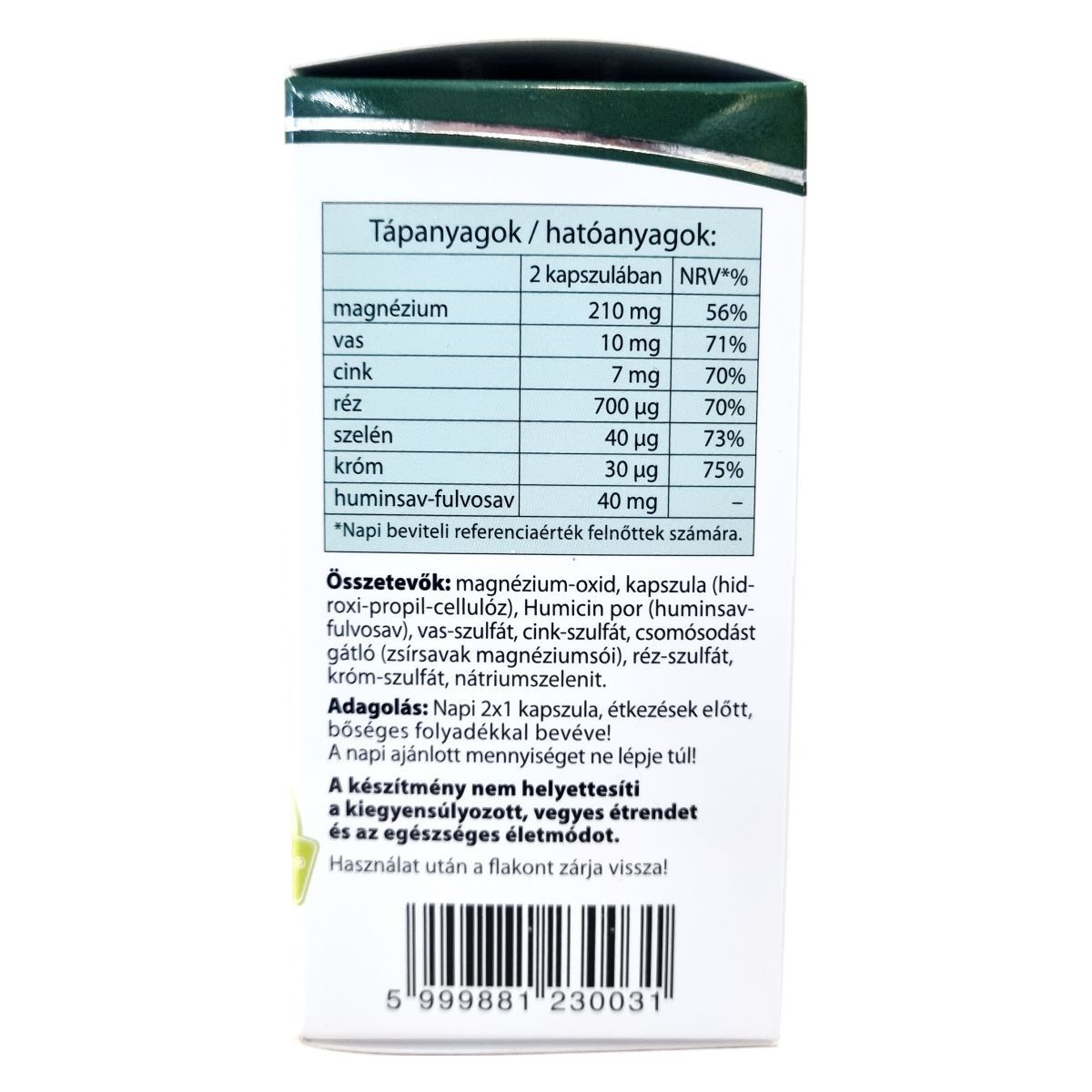 Magnézium-oxid, kapszula (hidroxi-propil-cellulóz), Humicin por (huminsav-fulvosav), vas-szulfát, cink-szulfát, csomósodást gátló (zsírsavak magnéziumsói), réz-szulfát, króm-szulfát, nátriumsze lenit.