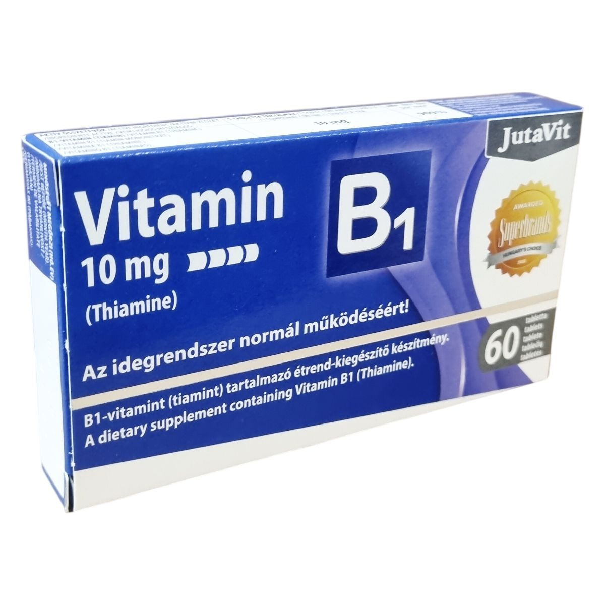A JutaVit B1-vitamin 10 mg-os tabletta B1-vitamint (tiamint) tartalmazó étrend-kiegészítő készítmény, amely a normál energiatermelő anyagcsere-folyamatokban vehet részt. A B1-vitamin hozzájárulhat az idegrendszer normál működéséhez, a normál pszichológiai funkció fenntartásához és a szív megfelelő működéséhez. Vízhatlan vitamin, ezért naponkénti pótlása szükséges, akár a B-vitamin-komplex további összetevőivel együtt. A hosszú távú használat esetén C-vitamin hiány léphet fel, így javasolt a megfelelő arányban történő alkalmazásuk. A termék fehérjék, zsírok, szénhidrátok anyagcseréjében, valamint sejtszintű anyagcsere-folyamatokban is szerepet játszhat. A doboz 60 tablettát tartalmaz, nettó tömege 12 g.