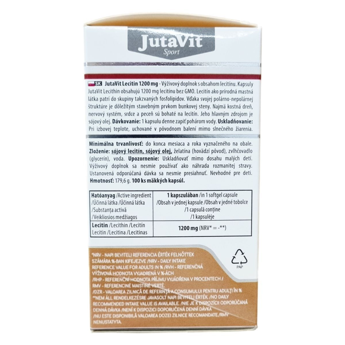 A JutaVit Lecitin kapszula 1200 mg GMO mentes lecitin tartalmú étrend-kiegészítő készítmény, amely a természetes zsírszerű anyagok, a foszfolipidek csoportjába tartozik. Poláros-apoláros szerkezete miatt a sejtfal fontos alkotórésze, különösen gazdag benne a csontvelő, az idegrendszer, a szív és a máj. A lecitin fő forrása a szójaolaj. A termék kizárólag természetes összetevőket tartalmaz, mint a szójalecitin, szójaolaj, marha eredetű zselatin, glicerin és víz. A termék 100 lágykapszulát tartalmaz, nettó tömege 179,6 g. Az adagolás napi 1 kapszula, mely vízzel egészben lenyelendő. A termék tárolása szobahőmérsékleten történjen, eredeti csomagolásban, gyermekektől elzárva, napfénytől védve. Az étrend-kiegészítő nem helyettesíti a változatos étrendet és az egészséges életmódot, és nem alkalmas gyermekek számára.