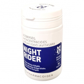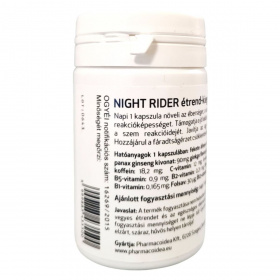 A NIGHT RIDER étrend-kiegészítő célja, hogy támogassa az éberséget, a koncentrációt és a reakcióképességet. A termék fekete áfonya, kóladió, panax ginseng és ginkgo biloba kivonatokat tartalmaz, amelyek hozzájárulhatnak a fáradtságérzet csökkentéséhez és az agy teljesítményének javításához. A multivitamin komplex részeként C-vitamin, A-vitamin, valamint különböző B-vitaminok találhatók benne, amelyek segíthetnek a szervezet megfelelő működésének fenntartásában. A termék fogyasztása nem helyettesíti a kiegyensúlyozott étrendet és az egészséges életmódot, és az ajánlott napi mennyiséget nem szabad túllépni.