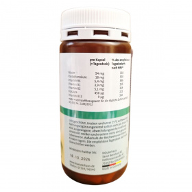 A Kräuterhaus Sanct Bernhard Vitamin B Komplex kapszula B-vitaminokat tartalmaz, amelyek hozzájárulhatnak a bőr és az idegrendszer normál működéséhez. A termék napi adagja biztosíthatja a szükséges B-vitaminokat.