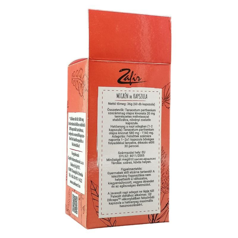 A Migrén kapszula kizárólag természetes, minőségileg gondosan ellenőrzött alapanyagból, a Tanacetumparthenium olajos kivonatának felhasználásával készül. Összetétel: Tanacetum parthenium szezámmag olajos kivonata. Hatóanyagok: sesquiterpen laktonok. Felhasználási javaslat: 1-2x1 kapszula naponta, alkalomszerűen. A flakon tartalma: 60 db "0" méretű DR bélben oldódó keményzselatin kapszula, 600 mg beltartalommal, 20mg természetes méhviasszal stabilizálva. Vegetáriánus és paleolit étrendet követők is fogyaszthatják.