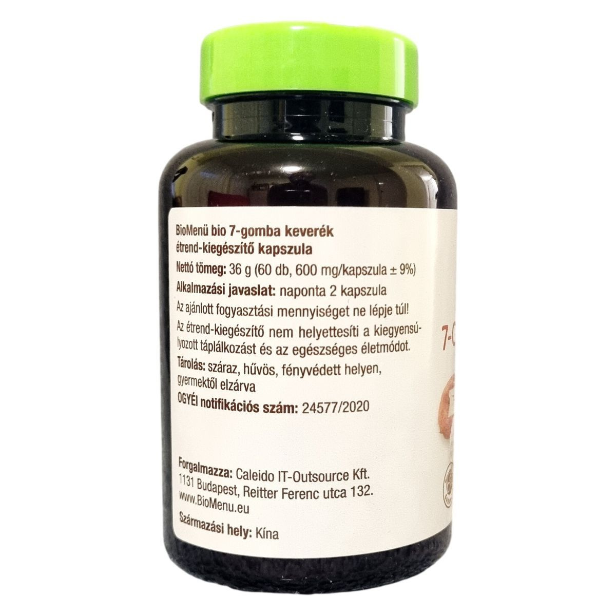 A BioMenü 7-Gomba keverék kapszula 60 darab 600 mg-os kapszulát tartalmaz. A termék származási helye Kína, a gombák biológiai minősítéssel (HU-ÖKO-02) rendelkeznek, és nem EU mezőgazdaságból származnak. A kapszulahéj hidroxpropil-metil-cellulózból készül, ami megfelel a vegán étrendnek. A termék organikus és nyers minősítésű, 100%-ban tiszta gombaporokat tartalmaz, amelyek számos fajta gombát foglalnak magukban, mint a ganoderma lucidum, inonotus obliquus, lentinus edodes, grifola frondosa, hericium erinaceus, cordyceps sinensis és tremella fuciformis. A kapszula napi adagja, azaz 2 kapszula, egyformán tartalmaz mind a hét gombafaj porát, mindegyiket 137,14 mg mennyiségben. A termék a természetesség és a minőség garanciájával bír, valamint minden kapszula vegán barát. Az ajánlott mennyiség betartása javasolt, és a termék nem helyettesíti az egészséges életmódot és a kiegyensúlyozott étrendet.