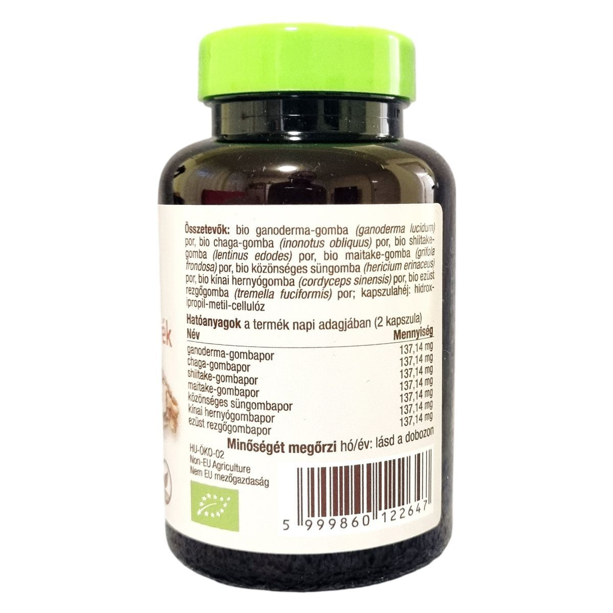 bio ganoderma-gomba por, bio chaga-gomba por, bio shiitake-gomba por, bio maitake-gomba por, bio közönséges süngomba por, bio kínai hernyógomba por, bio ezüst rezgőgomba por, kapszulahéj: hidroxpropil-metil-cellulóz