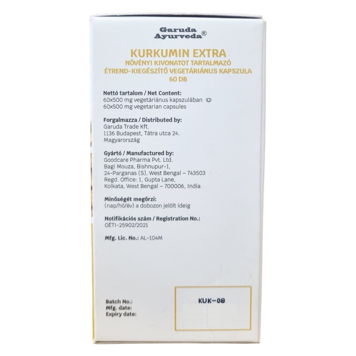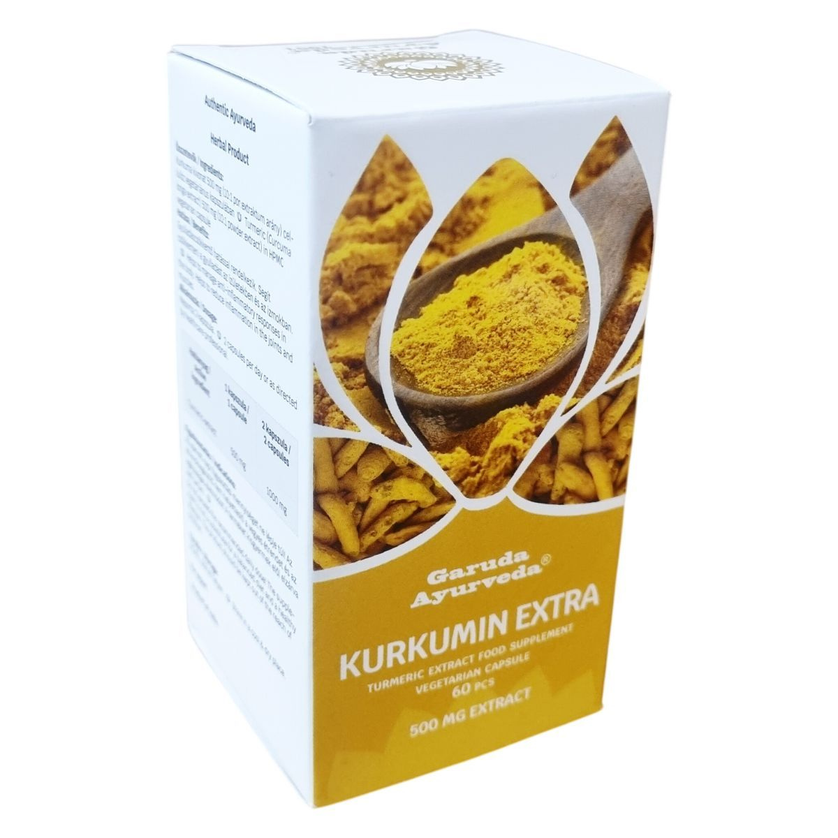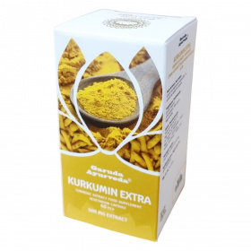 A Garuda Ayurveda® Kurkumin Extra készítmény az ősi ayurvedikus tudás és a modern szakértelem találkozásából született, gondosan válogatott természetes alapanyagok felhasználásával. A termék laboratóriumban tesztelt, garantált tisztaságú és biztonságú, GMP minőségű. A növényi kivonatú kapszulák 500 mg kurkuma-kivonatot tartalmaznak, melynek por és extraktum aránya 10:1. A termék nem tartalmaz hozzáadott cukrot, vegán kapszulában érhető el. Felhasználása során a gyulladáscsökkentő hatások révén támogathatja a szervezet válaszreakcióit, különösen az ízületek és izmok területén. A terméket kisgyermekek elől elzárva kell tartani, és nem helyettesíti a változatos, egészséges étrendet és életmódot. Export célokra készült, Indiai eredetű termék.