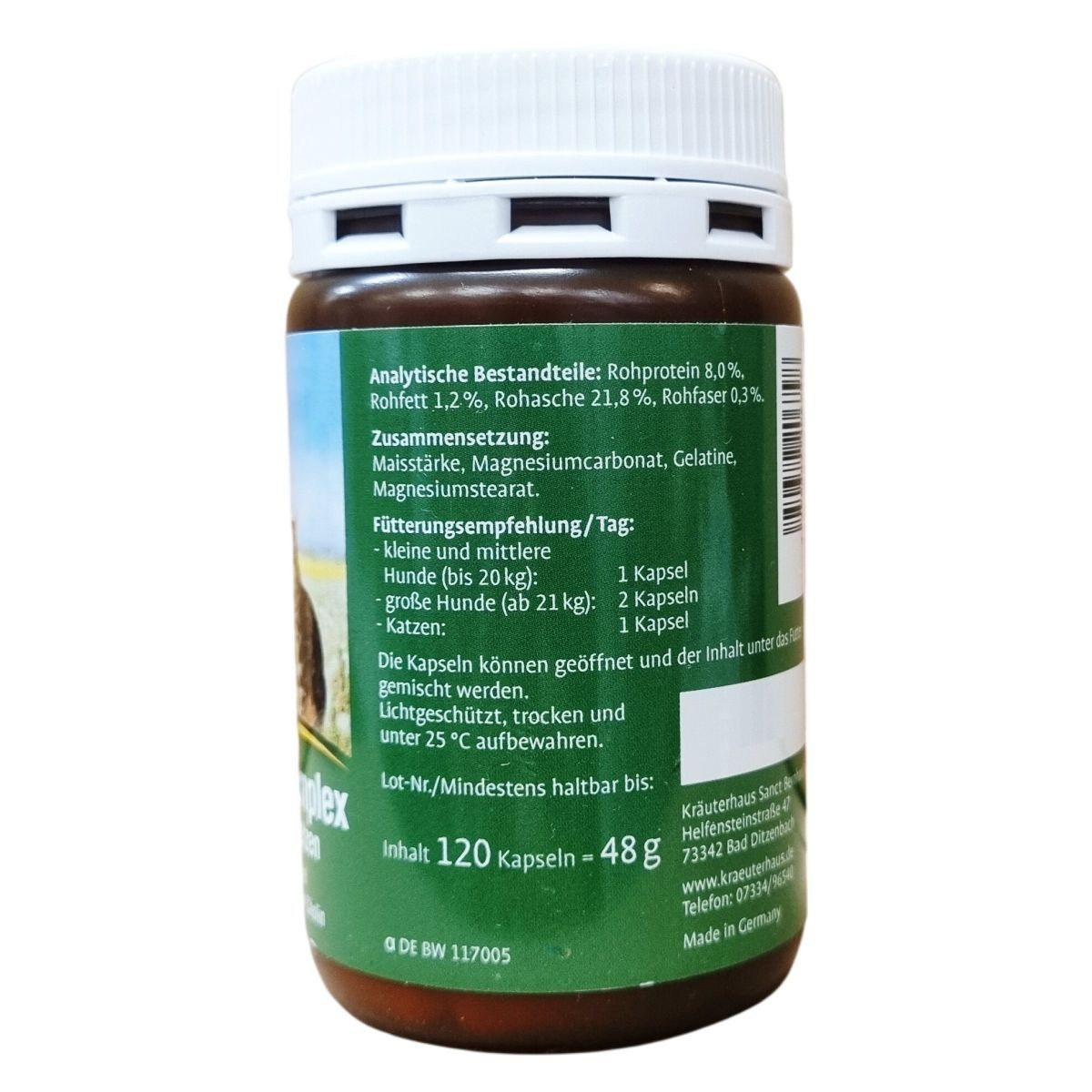 Analitikai összetevők: nyersfehérje 8,0%, nyerszsír 1,2%, nyershamu 21,8%, nyersrost 0,3%. Kiegészítő takarmány kutyák és macskák részére. Kiszerelés: 120 kapszula (48 g). Tételszám és minőségmegőrzési idő a csomagoláson feltüntetve. Németországban gyártva. Azonosító: α DE BW 117005.