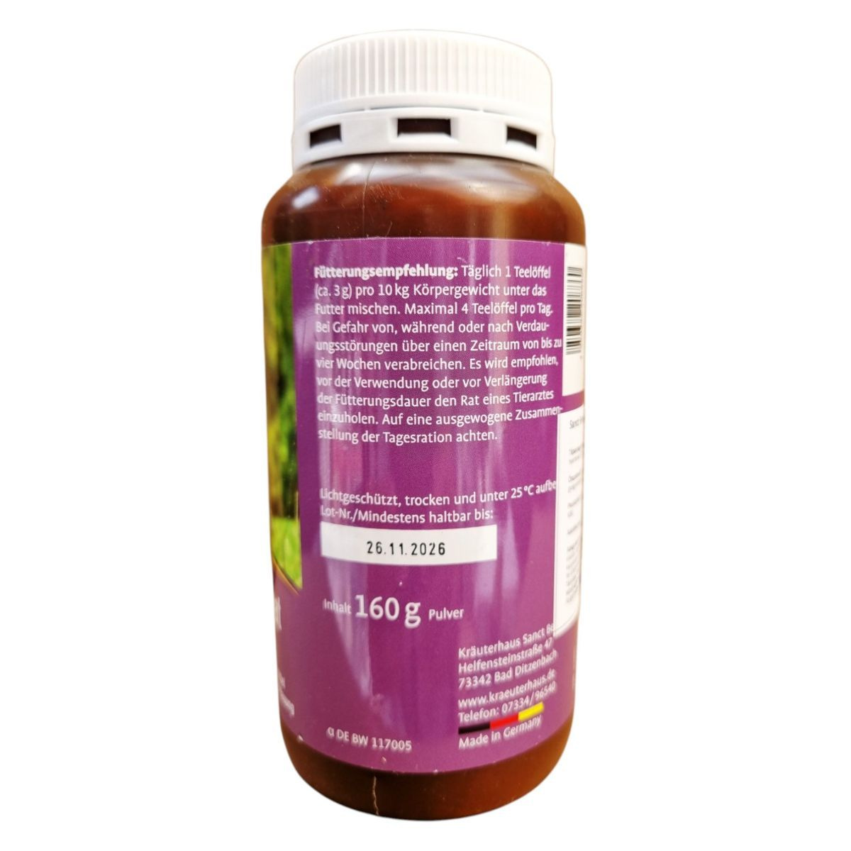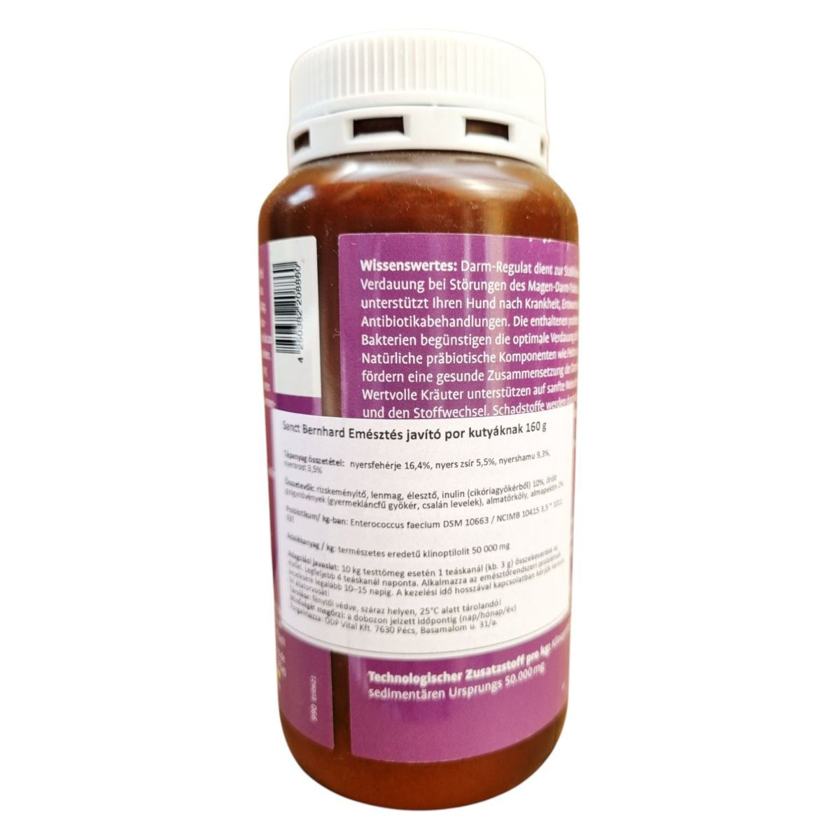 A Sanct Bernhard Emésztés javító por kutyáknak egy probiotikus diétás kiegészítő, amely segíthet a kutyák emésztésének stabilizálásában, különösen emésztési zavarok esetén. A termék probiotikus baktériumokat tartalmaz, amelyek elősegíthetik az optimális emésztést, valamint természetes prebiotikus összetevőket, mint az inulin, amelyek támogathatják a bélflóra egészséges összetételét. A termék gyógynövényeket is tartalmaz, amelyek gyengéden támogathatják az emésztést és az anyagcserét. A termék használata előtt vagy a használati idő meghosszabbítása előtt ajánlott állatorvossal konzultálni. Tárolása fénytől védve, száraz helyen, 25°C alatt javasolt.
