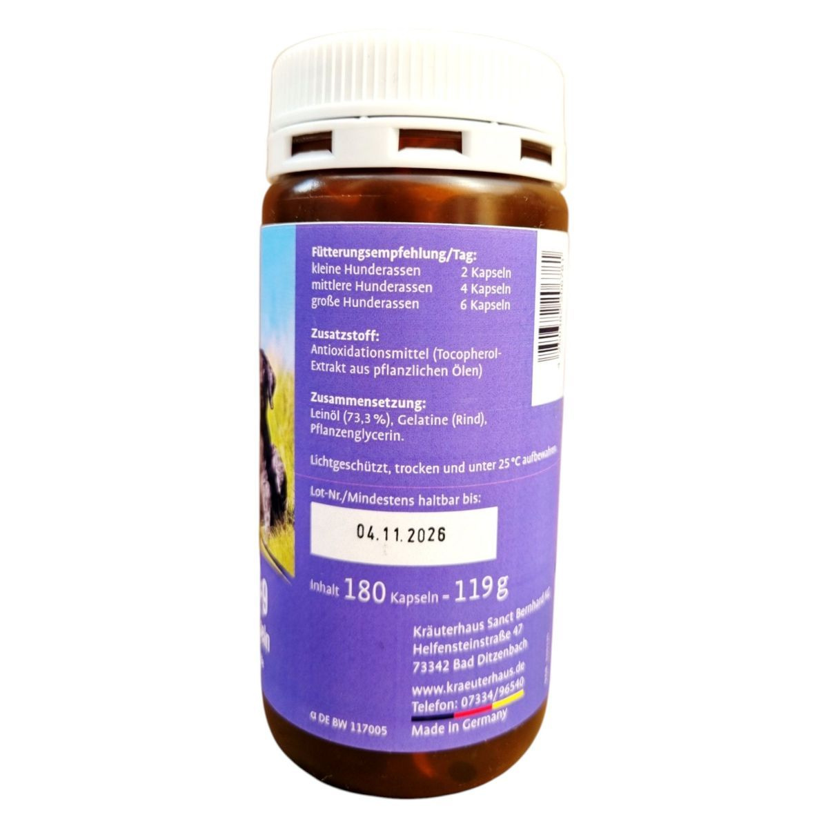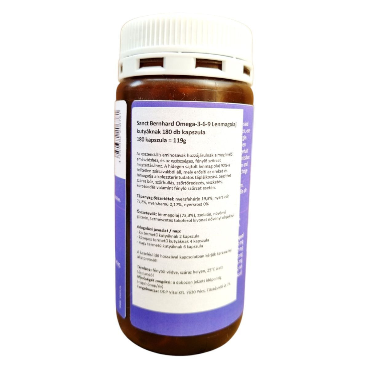 A Sanct Bernhard Omega-3-6-9 Lenmagolaj kapszulák kifejezetten kutyák számára készültek, hogy támogassák az egészséges emésztést és a szőrzet állapotát. A termék hidegen sajtolt lenmagolajat tartalmaz, amely gazdag telítetlen zsírsavakban, és antioxidáns hatású tokoferol kivonattal van kiegészítve. Az ajánlott napi adag a kutya méretétől függően változik, és a kapszulák rendszeres használata segíthet a száraz bőr, szőrhullás, szőrtöredezés, viszketés és korpásodás kezelésében. A terméket fénytől védett, száraz helyen, 25°C alatt kell tárolni.