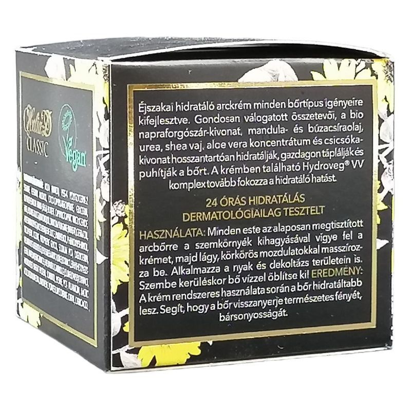 Éjszakai hidratáló arckrém minden bőrtípus igényeire kifejlesztve. Gondosan válogatott összetevői, a bio napraforgószár-kivonat, mandula és búzacsíra olajok, urea, shea vaj, aloe vera koncentrátum és csicsóka kivonat hosszantartóan hidratálják, gazdagon táplálják és puhítják a bőrt. A krémben található komplex (Hydroveg VV) tovább fokozza a hidratáló hatást. Tesztek igazolják, hogy a bőr 24 óra elteltével is hidratált marad. 24 órás hidratáltság, dermatológiailag tesztelt.
