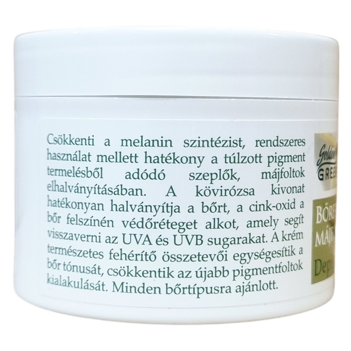 A krém csökkenti a melanin szintézist, így rendszeres használat mellett hatékonyan halványítja a szeplőket, májfoltokat és a túlzott pigmenttermelésből adódó barna foltokat. A kövirózsa kivonat hatékonyan világosítja a bőrt, míg a cink-oxid védőréteget képez a bőr felszínén, amely visszaveri az UVA és UVB sugarakat. A természetes fehérítő összetevők elősegítik a bőr tónusának egységesítését és segítenek megelőzni az új pigmentfoltok kialakulását. A termék minden bőrtípusra ajánlott.
