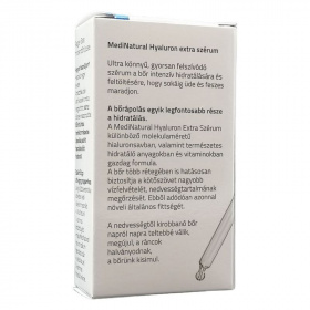 A MediNatural hyaluron extra szérum ultra könnyű, gyorsan felszívódó szérum, a bőr intenzív hidratálására és feltöltésére, hogy az sokáig üde és feszes maradjon. Természetes alapanyagokból álló bőrfiatalító MediNatural hyaluron extra szérum, mely azonnali hidratáltságot és rugalmasságot kölcsönözhet a bőrnek különlegesen magas hyaluronsav- és vitamintartalmának köszönhetően.