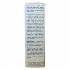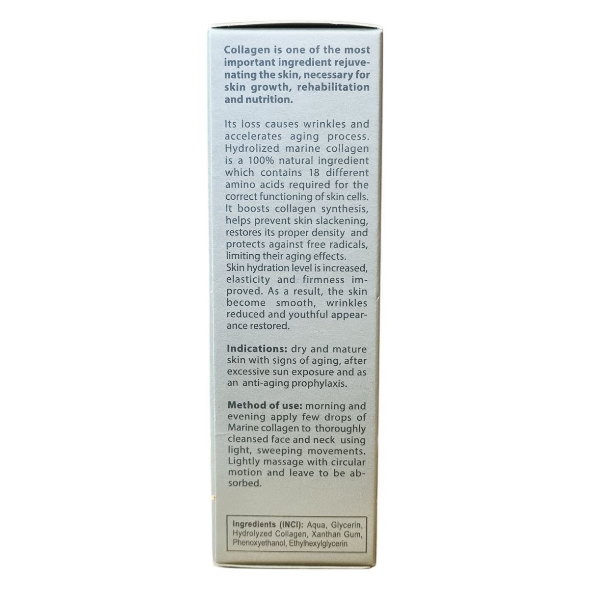 A kollagén a bőrmegújulás egyik legfontosabb összetevője, mely hiányában a ráncok kialakulnak, és az öregedési folyamat felgyorsul. A hidrolizált tengeri kollagén 100%-ban természetes és 18 aminosavat tartalmaz, melyek a bőr természetes kollagéntermeléséhez szükségesek. Kis molekulaméretének köszönhetően mélyen a bőrbe jutva fejti ki hatását, javítja a bőr vízmegkötő képességét, növeli a bőr rugalmasságát és feszességét. Használata javallott száraz, rugalmasságát vesztett, érett bőrre, továbbá intenzív napozás után fellépő bőrszárazság kezelésére is.