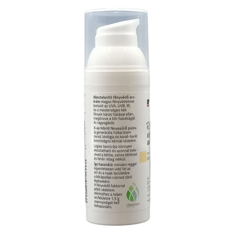 Mindennapos használattal a fényvédő arckrém segít a ráncok elleni harcban, halványítja a mimikai ráncokat és a szarkalábakat. Magas fényvédelmet biztosít az UVA, UVB, IR, és a mesterséges kék fény káros hatásai ellen.