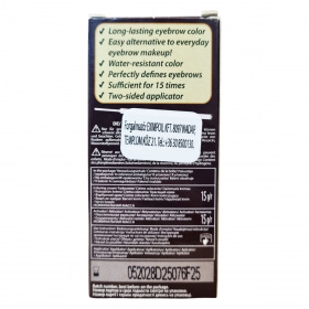 Tartós szemöldök krémfesték professzionális használatra. Hosszan tartó, vízálló színt ad, pontosan meghatározza és kiemeli a szemöldök formáját. A termék kétoldalas applikátorral rendelkezik, és akár 15 festéshez is elegendő. A csomag tartalma: 15 g színező krém, 15 g aktivátor, applikátor és használati utasítás. A festék és az aktivátor keverési aránya 1:1. A termék +5 °C és +25 °C közötti hőmérsékleten használható. Gyártva Lengyelországban, az Európai Unióban. A gyártási tételszám és a minőségmegőrzési idő a csomagoláson található.