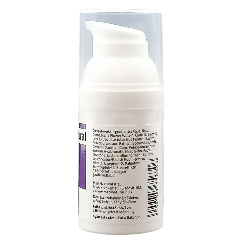 Összetevők/Ingredients: AQUA, ROSA DAMASCENA FLOWER WATER*, CAMELLIA SINENSIS LEAF EXTRACT, LACTOBACILLUS FERMENT LYSATE, PUNICA GRANATUM EXTRACT, SODIUM LEVULINATE, GLYCERIN, XANTHAN GUM, POTASSIUM SORBATE, SODIUM HYALURONATE, HESPERIDIN METHYL CHALCONE, LACTOBACILLUS FERMENT, CAFFEINE, LEUCONOSTOC/RADISH ROOT FERMENT FILTRATE, DIPEPTIDE-2, PALMITOYL TETRAPEPTIDE-3, STEARETH-20* Ellenőrzött ökológiai gazdálkodásból.