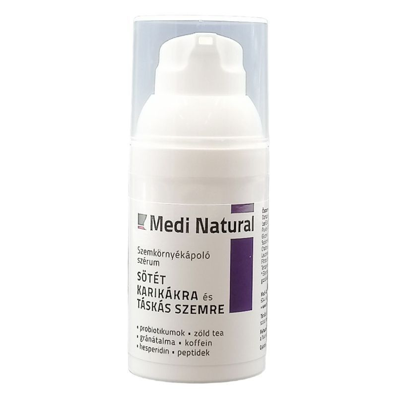 Ismerd meg a MediNatural Szemkörnyékápoló szérumot, ami kifejezetten arra lett kifejlesztve, hogy csökkentse a sötét karikák, a szem alatti püffedtség és a fáradt bőr jelenlétét!Ez a rendkívül különleges szérum egy átfogó és egyedülálló komplexe a probiotikumoknak, a zöld teának, a gránátalmának, a koffeinnek és a modern technológia segítségével felhasznált peptideknek. A speciális növényi hatóanyagok egyedi kombinációjával stimulálja a mikrocirkulációt a szemkörnyéken, helyreállítva a bőr rugalmasságát és tónusát, amely forradalmian új és látványos kezelést ígér a szemkörnyéki sötét karikák, szem alatti püffedt bőr számára. Táskás, karikás a szemed? Akkor ez a csodás szérum pont neked való! Használd minden nap és tapasztald meg, ahogy egyre frissebb és üdébb tekintet néz vissza rád a tükörből!