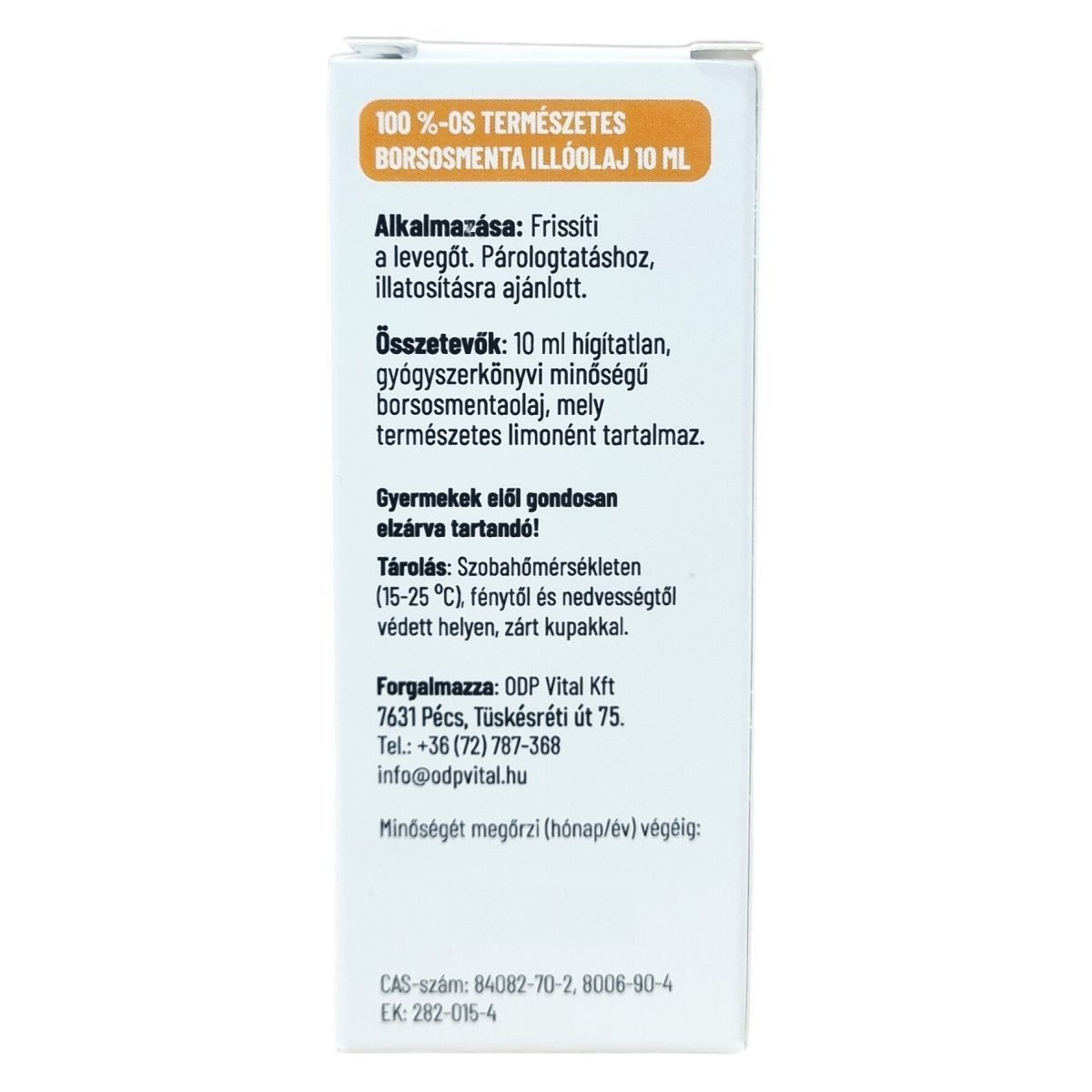 10 ml hígítatlan, gyógyszerkönyvi minőségű borsosmentaolaj, természetes limonén.