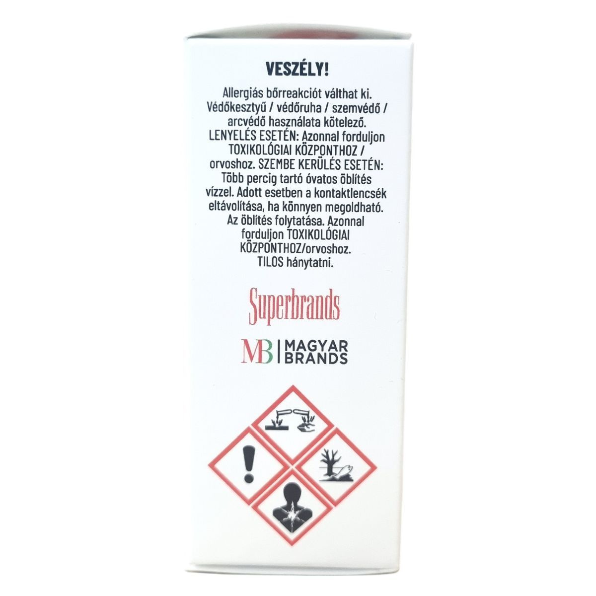 Védőkesztyű, védőruha, szemvédő vagy arcvédő használata kötelező. Lenyelés esetén azonnal forduljon toxikológiai központhoz vagy orvoshoz. Szembe kerüléskor több percig tartó óvatos öblítés vízzel, szükség esetén kontaktlencsék eltávolítása, majd az öblítés folytatása. Tilos hánytatni.
