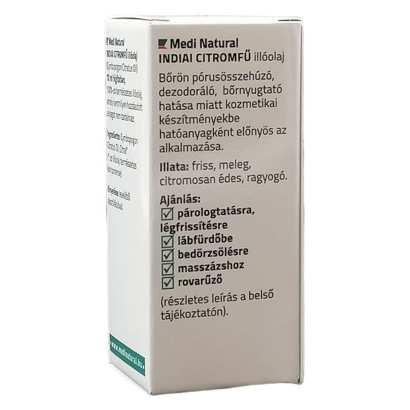 Természetes rovarűző! Az indiai citromfű illóolaj frissítő, növeli a koncentrációs készséget, biztató, motiváló hatású, légtér-illatosítókba ajánlott, tisztítja a beltéri levegőt, gépkocsiban fokozza a vezető éberségét.
