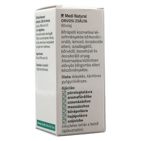A Medi Natural Orvosi Zsálya illóolaj egy 100%-os tisztaságú, természetes növényi illóolaj, amely vízgőzdesztillációval, a zsálya leveleiből készül. Édeskés-kámforos aromájának és hatóanyagainak köszönhetően alkalmazható bőrápolásra, aromaterápiára, valamint kozmetikai készítmények összetevőjeként. Frissítő, fertőtlenítő, bőrösszehúzó és dezodoráló hatásával hozzájárulhat a bőr természetes egyensúlyának megőrzéséhez, miközben kellemes, gyógynövényes illatot biztosít. A termék hígítatlan, mesterséges adalékanyagoktól mentes, és sokoldalúan felhasználható otthoni és professzionális kozmetikai célokra is.