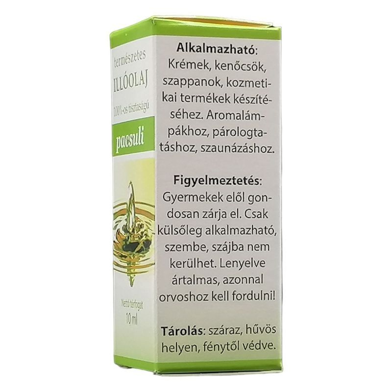 Figyelmeztetés: nem mérgező, nem irritál, fototoxikus hatása nincs. Előállítás: az illóolajat vízgőz desztillációval állítják elő. Összetétel, hatóanyagok: pacsulol, bulensen, guaien, pacsulen.