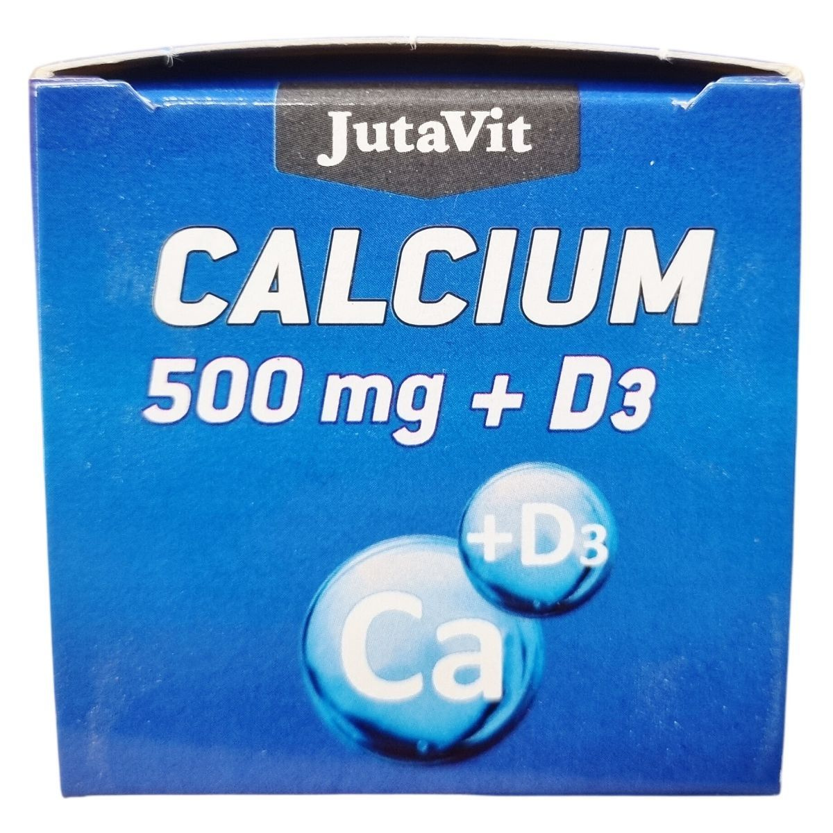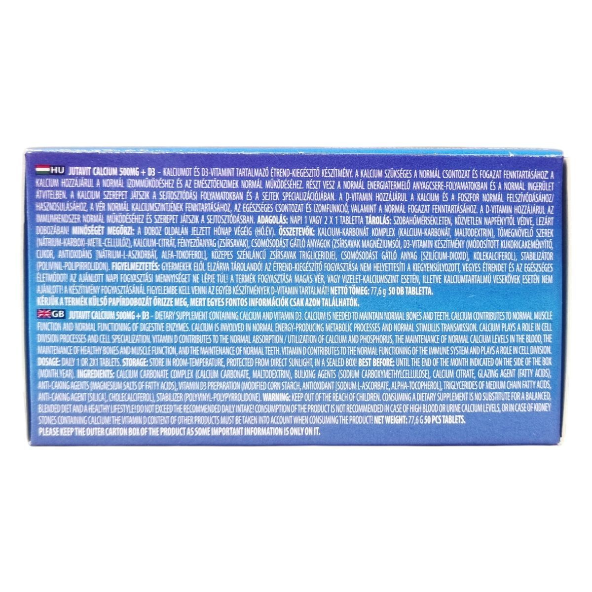 A JutaVit Calcium 500 mg + D3 tabletta kalcium- és D3-vitamin tartalmú étrend-kiegészítő. A kalcium szükséges a csontok és fogak normál állapotának fenntartásához, az izmok, az emésztőenzimek és az anyagcsere számos folyamataiban fontos szerepet játszhat. A D3-vitamin elősegítheti a kalcium és foszfor normál felszívódását és hasznosulását, támogathatja az egészséges csont- és fogállapotot, az izomműködést, továbbá hozzájárulhat az immunrendszer megfelelő működéséhez és a sejtosztódási folyamatokhoz. A termék napi 1-2 tablettás adagolással használható. A terméket a gyermekektől elzárva kell tartani, és nem helyettesítheti a kiegyensúlyozott étrendet vagy az egészséges életmódot. Nem javasolt azok számára, akiknek magas a vér vagy vizelet kalciumszintje, illetve kalciumtartalmú vesekövük van. A készítmény összetevői között megtalálható a kalcium-karbonát és kalcium-citrát, valamint a kolekalciferol formájában lévő D3-vitamin. A csomagolás 50 tablettát tartalmaz, nettó tömege 77,6 g.
