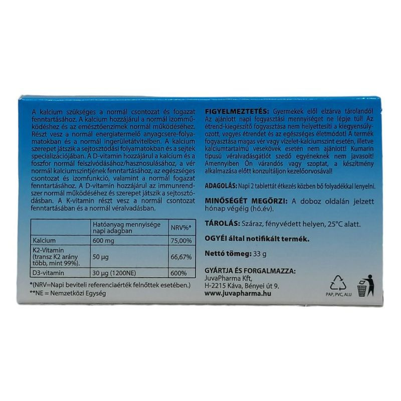 A D3-vitamin hozzájárul a kalcium és a foszfor normál felszívódásához/hasznosulásához, a vér normál kalciumszintjéhez, az egészséges csontozathoz, az egészséges izomfunkció fenntartásához valamint szerepet játszik a sejtosztódásban is. A Kalcium fontos az egészséges csontok és fogak fejlődéséhez. Hozzájárul a normál fogazat fenntartásához, az immunrendszer normál működéséhez. A K2-vitamin részt vesz a normál csontozat fenntartásában és a normál véralvadásban. Adagolás: napi 2 x 1 tabletta.