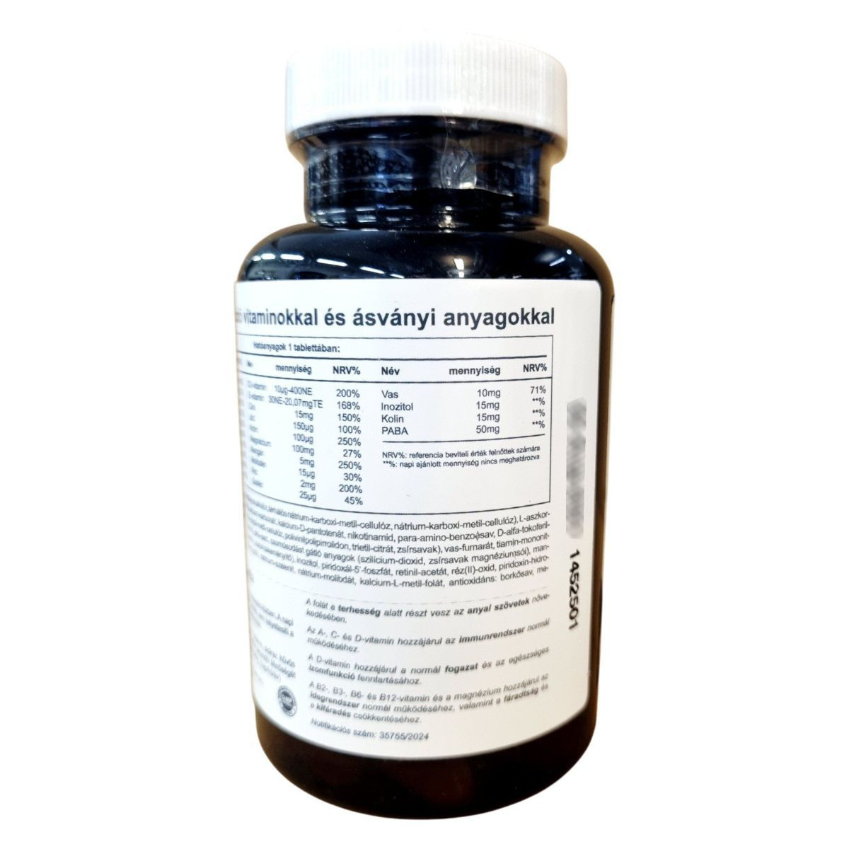 A Vitaking 9 Hónap Multivitamin kifejezetten várandós és szoptatós édesanyáknak készült, és folsavat, valamint aktív B12-vitamint tartalmazhat. A folát a terhesség alatt részt vehet az anyai szövetek növekedésében, míg az A-, C-, és D-vitamin hozzájárulhat az immunrendszer normál működéséhez. A D-vitamin továbbá támogathatja a normál fogazat és csontozat fenntartását. A termék 60 tablettát tartalmaz, és napi egy tabletta fogyasztása javasolt étkezés közben.