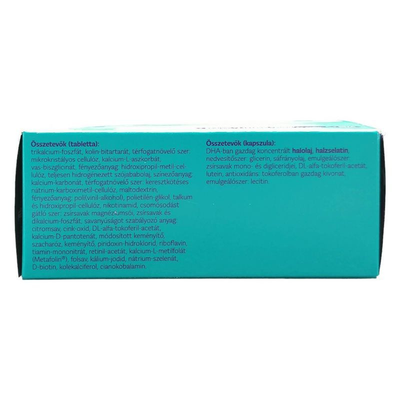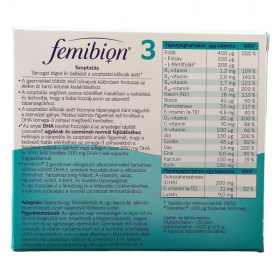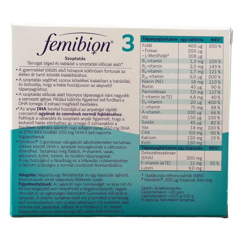 A Femibion 3 étrend-kiegészítő, amely nem helyettesíti a változatos, kiegyensúlyozott étrendet és az egészséges életmódot! Az ajánlott napi mennyiséget (napi 1 tabletta + napi 1 kapszula) ne lépje túl! Gyermekek elől elzárva tartandó! A-vitamin tartalma miatt ezt a terméket a terhesség első trimeszterében nem szabad alkalmazni. Ha a szoptatás alatt teherbe esik, javasoljuk, hogy váltson át a Femibion 1-re, amelyet kifejezetten a korai terhesség időszakára fejlesztettünk ki. Ez az oldal nemzetközi közönségnek ad tájékoztatást. Nem biztos, hogy az oldalon található összes termék elérhető az adott országban, és a helyi információk - ideértve a termékspecifikus információkat is - országonként eltérőek lehetnek. Az adott országban elérhető termékinformációkért kérjük, keresd az adott ország weboldalát. A folát (folsav és Metafolin ) hozzájárul a normál vérképződéshez, szerepet játszik a sejtosztódásban. Az anyai DHA bevitel hozzájárul az anyatejjel táplált csecsemő agyának és szemének normál fejlődéséhez. Ezért kiegészítésként a felnőttek számára ajánlott napi adagon, azaz 250 mg Omega-3 zsírsav (DHA és EPA) felül további 200 mg DHA-t kell naponta fogyasztani.