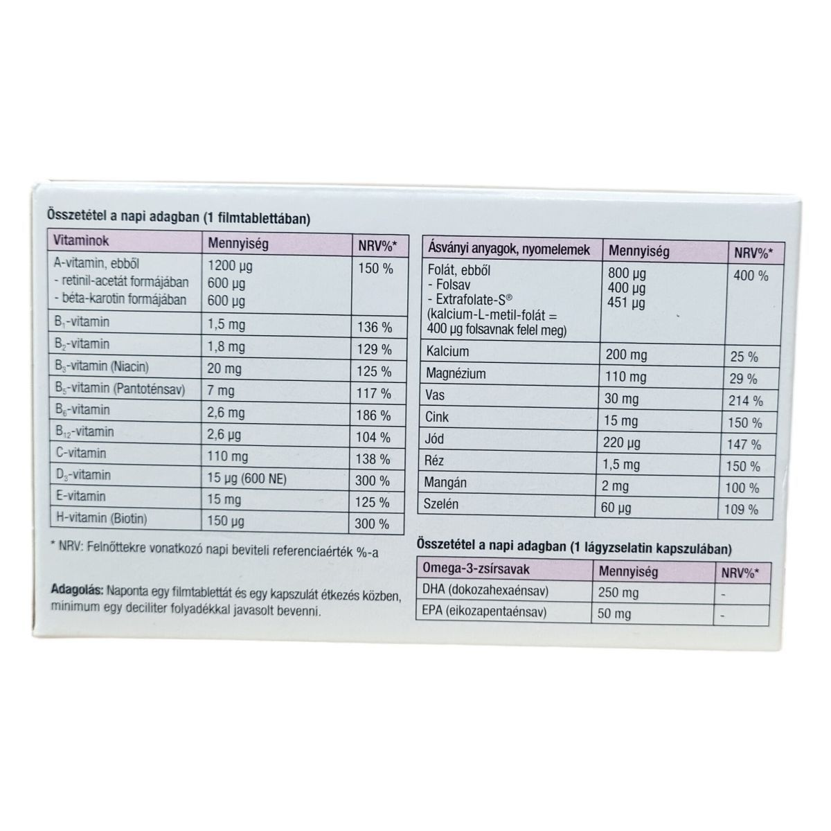 Naponta egy filmtablettát és egy lágyzselatin kapszulát étkezés közben, minimum egy deciliter folyadékkal javasolt bevenni.