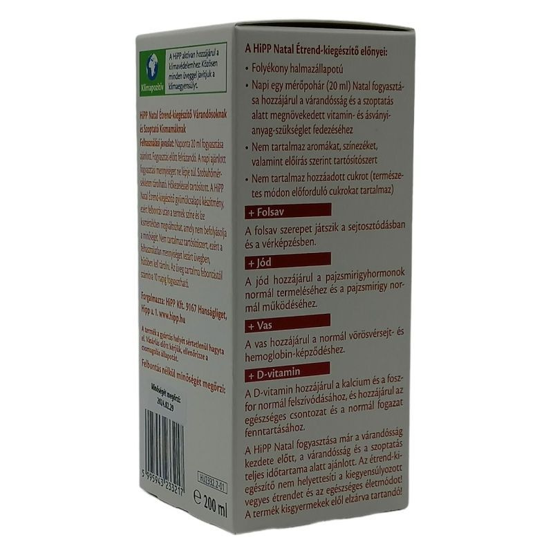 A Hipp Natal szirup (étrend-kiegészítő készítmény) fogyasztása hozzájárul a megnövekedett vitamin- és ásványianyag-szükséglet fedezéséhez a terhesség alatti és utáni időszakban.