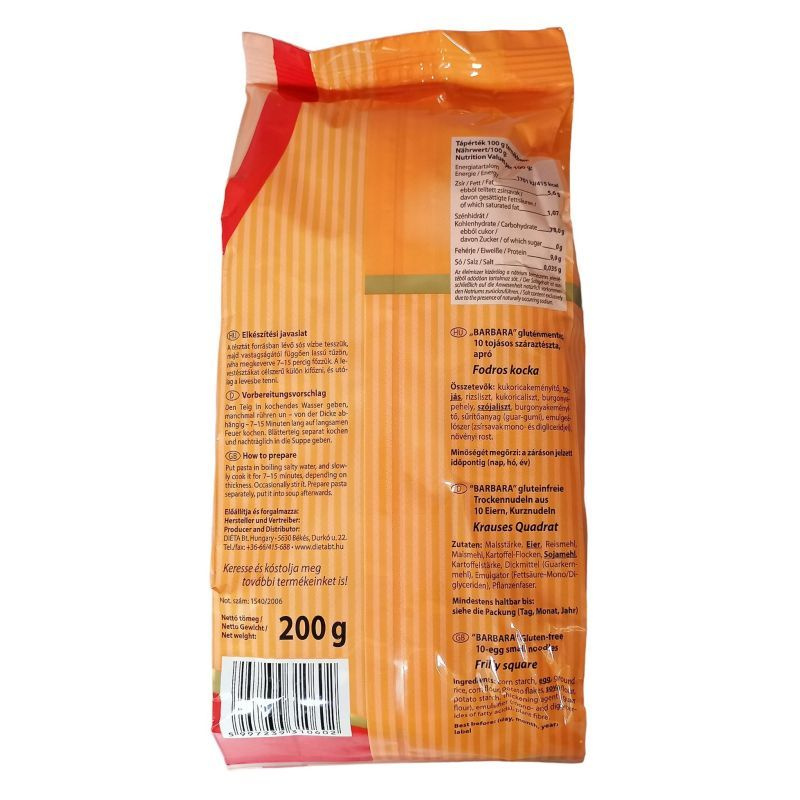Nettó tömeg: 200 g. Not. Szám: 1541/2006, Tápérték 100 gramm késztermékben: Energiatartalom: 1701 kJ (405 kcal), Fehérje: 9, 9 g, Szénhidrát: 78, 0 g, Zsír: 5, 6 g, Minőségét megőrzi: 18 hónapig.