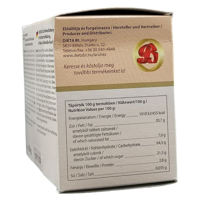 Töltetlen illetve töltött süteményeink közül egyaránt válogathatnak a lisztérzékenyek. Praktikus visszazárható csomagolás, viszonylag hosszú minőség megőrzési idő jellemzi ezeket a termékeket. Nettó tömeg: 180 g. Not. Szám: 1124/2006. Tápérték 100 gramm késztermékben: Energiatartalom: 1910 kJ (455 kcal), Fehérje: 2, 8 g, Szénhidrát: 64, 5 g, Zsír: 20, 7 g. Minőségét megőrzi: 6 hónapig.