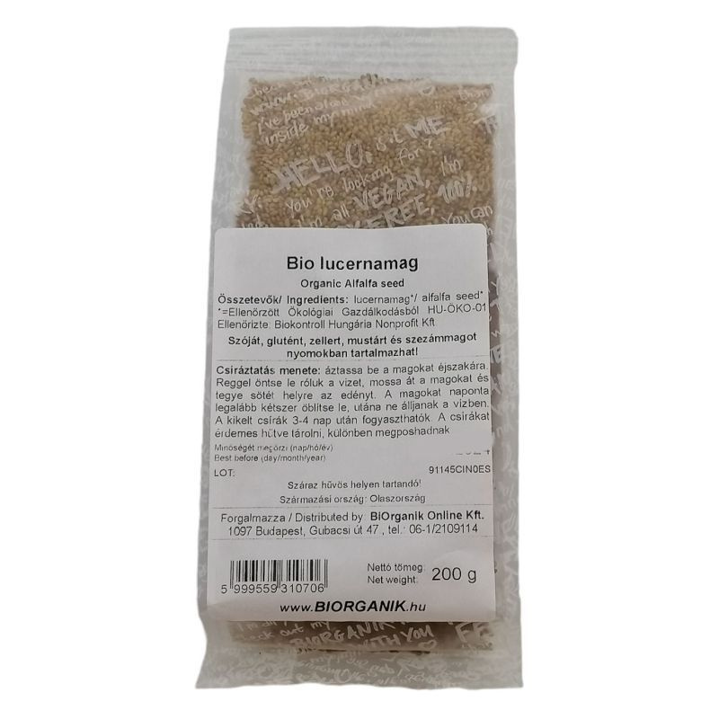 Összetevők: lucerna mag Ellenőrzött Ökológiai Gazdálkodásból HU-ÖKO-01. Ellenőrizte: Biokontroll Hungária Nonprofit Kft. Vitamin: A, B, C, E, K. Felhasználási javaslat: csíráztatáshoz.