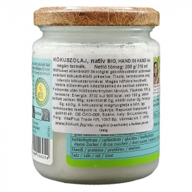 Ellenőrzött ökológiai gazdálkodásból származó szárított kókuszbélből préselve. Tiszta, természetes olaj, intenzív kókuszaromával. Magas hőfokra hevíthető, Ideális sütemények készítéséhez és zsírban sütéshez. Felbontás után hűtőszekrényben tároljuk. A kókuszolaj megnyugtatja a bőrt, így természetes testápoló is.