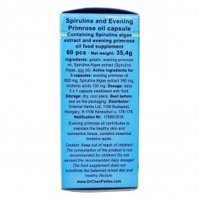 A Dr. Chen Patika algás ligetszépe kapszula 100%-ban természetes spirulina alga és ligetszépe olaj lágyzselatin kapszula formában. Kizárólag természetes összetevőket tartalmaz, így hozzájárulhat a bőr és kötőszövet egészségének fenntartásához. A spirulina alga kivonat mellett a ligetszépe olaj esszenciális linolénsavakat tartalmaz, melyek kedvezően hathatnak a szervezet működésére. A termék nettó tömege 35,4 g, és ajánlott napi adagja három kapszula, amely könnyen beilleszthető a mindennapi étrendbe. Tárolása száraz, hűvös helyen javasolt. A kapszulák gyártója és forgalmazója az Oriental Herbs Kft., amely 1994 óta kínál minőségi termékeket. A fogyasztás előtt mindig vegye figyelembe az ajánlott mennyiséget, valamint tartsa távol gyermekektől. Ez az étrend-kiegészítő nem helyettesíti a kiegyensúlyozott étrendet és az egészséges életmódot.