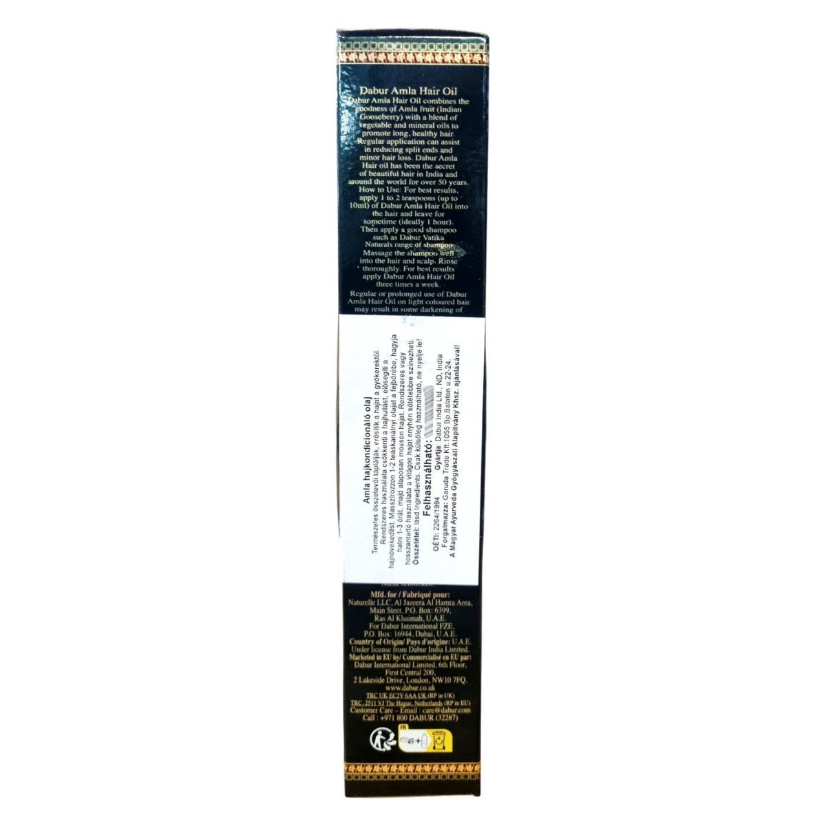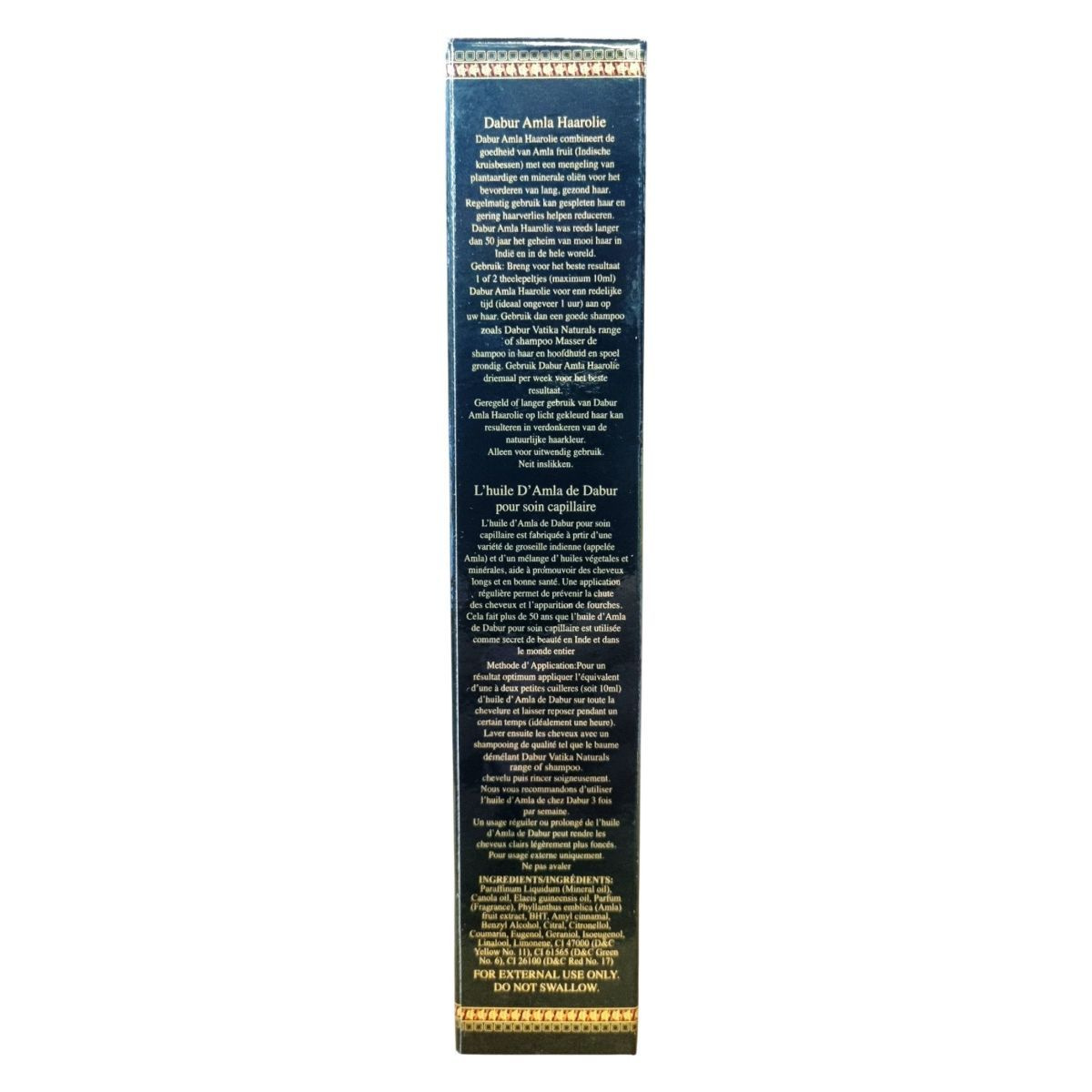 A Dabur Amla Hair Oil az indiai ájurvédikus hagyományokon alapuló hajápoló olaj, amely az amla (indiai egres) természetes jótékony hatásait ötvözi növényi és ásványi olajokkal. Rendszeres használata hozzájárulhat a hajvégek ápolásához és a hajhullás mérsékléséhez. Több mint öt évtizede népszerű hajápolási titok Indiában és világszerte. A termék kizárólag külső használatra készült, és gondosan kiválasztott összetevői révén táplálhatja a hajat és a fejbőrt, segíthet visszaadni a haj természetes fényét és rugalmasságát. A csomagolás többnyelvű leírást tartalmaz (angol, magyar, holland, francia), és jelzi, hogy a termék rendszeres alkalmazása világos hajon enyhe sötétedést eredményezhet.