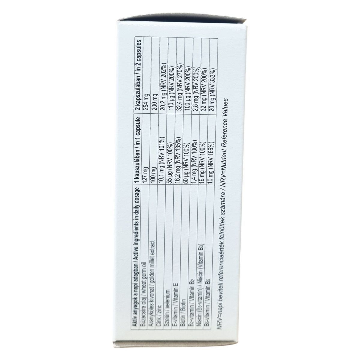 A készítmény természetes E-vitamin tartalmú búzacsíra olajat, aranyköles kivonatot, vitaminokat és ásványi anyagokat tartalmaz.
