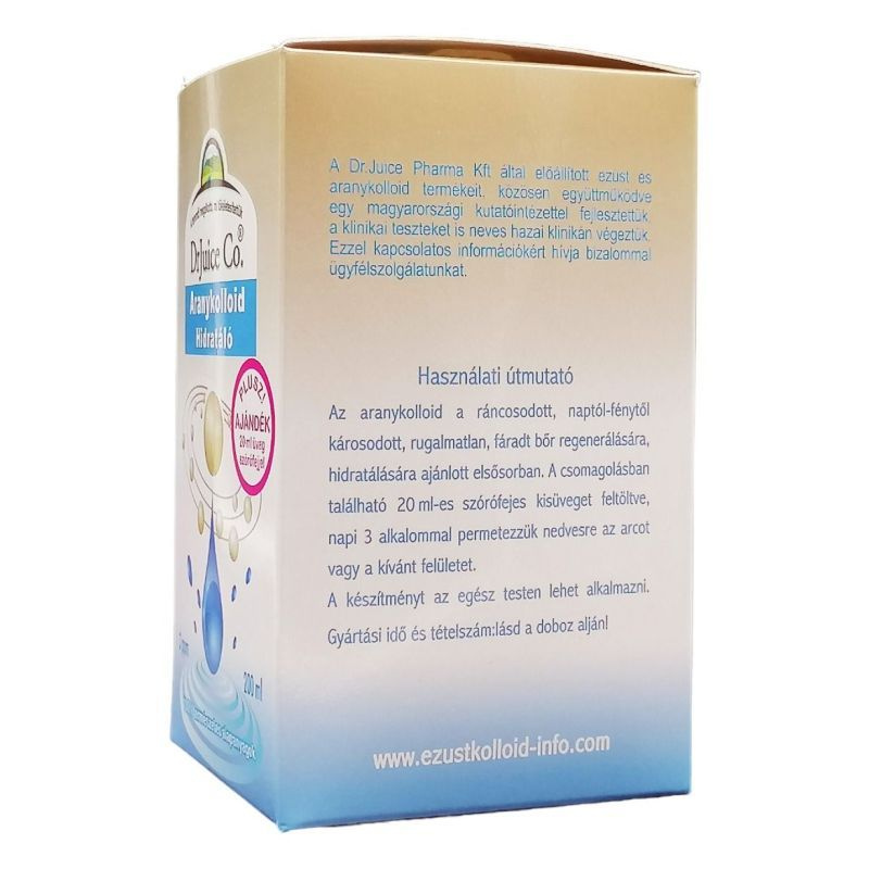 Az aranykolloid hidratáló alkalmazása: érett, ráncos bőrre, öregségi foltokra, nap által károsodott, pigmentált bőrre, zsíros és pattanásos bőrre, rugalmatlan, fakó bőrre, fáradt, értágulatos, bőrre . A készítmény csomagolásában található 20 ml-es kisüveget feltöltve, napi 3 alkalommal permetezzük az arcra, vagy a kívánt felületre. Az Aranykolloid Hidratáló, ugyanúgy, mint egyéb ezüstkolloid termékeink az egészségre ártalmatlan, kizárólag arany allergia esetén ellenjavallt az alkalmazása. Összetevők: Arany (kolloid) 3 ppm, Koncentráció tömeg 100 ml-ben %: Aqua: 99,99 %, Arany: 0,01 % .