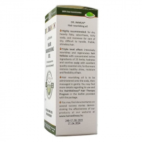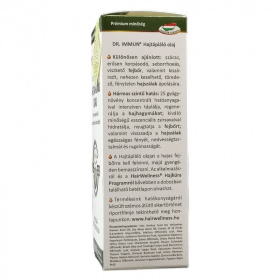 Ezáltal ellenállóbbá válik a fejbőr a külső károsító hatásokkal szemben, a hajszálak pedig visszanyerik rugalmasságukat. A Dr. Immun hajápoló olaj a hajat dússá, rugalmassá, selymesen puhává varázsolja. A készítmény erősíti, táplálja és regenerálja a hajhagymákat. Mi szól az eddig használt hajtápláló készítményeid ellen? A különböző vegyszeres hajápoló szerek és kezelések, szárítják fejbőrünket és hajszálainkat. Felborítják a bőr mikroklímáját, hiszen az irritáció hatására a faggyúmirigyek vagy túl kevés vagy túl sok zsiradékot kezdenek el termelni, ami megváltoztatja környezetük pH értékét. A csökkenő savas kémhatás, már nem lesz képes megakadályozni az élősködő mikroorganizmusok elszaporodását, így fejbőrbetegségek alakulhatnak ki. A gyulladással járó fertőzések pedig károsíthatják, sőt el is pusztíthatják a hajhagymákat, ezáltal hajhullást is okozhatnak. Egy szőrtüszőből életünk folyamán kb. 25 új hajszál nő ki. Hajhullás, korpásodás, hajhullás ellen, hajhullás. Amennyiben gyakran hullik a hajunk, hamar kimeríthetjük és lerövidíthetjük a hajhagymáink élettartamát, korai és végleges kopaszodást eredményezve. Miért jó választás a Dr. Immun hajápoló olaj? A termék egyik fő előnye: a kezelés után a megmosott haj nem marad zsíros hatású! Ideális ápolás a száraz, töredezett és fénytelen hajnak. Kúraszerűen alkalmazva, kiváló hajhullás, korpásodás ellen, regeneráló hatású. A Dr. Immun Hajápoló olaj teljes mértékben helyettesíti a szintetikus balzsamokat. Kizárólag élő anyagok, gyógynövények kivonatai és növényi olajok az összetevői. Mentes bárminemű szintetikától, sem kémiai, sem állati eredetű összetevőket nem tartalmaz. Mik a Dr. Immun hajápoló olaj hatóanyagai? Bázisolajai a kukoricacsíra olaj és olívaolaj, melyek 25 gyógynövény aktív összetevőit tartalmazzák. A Dr. Immun Hajápoló Olaj magában rejti a gyógynövények természetes hatóanyagait: így vitaminokat, ásványi anyagokat, éterikus olajokat, szénhidrátokat, festékanyagokat, antibiotikumokat, alkaloidokat, glikozidokat, szaponinokat, keserűanyagokat, cserzőanyagokat, szerves savakat, fitoncidákat, karotinoidokat, kumarinokat, és lektineket. Hogyan fejti ki hatását? A Dr. Immun Hajápoló Olaj természetes hatóanyagai behatolnak a fejbőrbe, hajtüszőkbe, és védőréteget képeznek minden egyes hajszálon, megakadályozva, hogy elveszítsék természetes zsírrétegüket. Táplálja és dússá varázsolja a hajat, selymesen puhává, simábbá és kezelhetőbbé varázsolja. Kúraszerű használata során serkenti a hajnövekedést, regenerálja a hajhagymákat, erősíti a hajszálakat. A száraz fejbőrbe történő bemasszírozás fokozza a hajhagymák vérkeringését, segíti eltávolítani a méreganyagokat, kórokozókat, így a hajhagymák levegőhöz, tápanyaghoz jutnak. Felhasználási javaslat: A Dr. Immun Hajápoló Olajat hajpakolásként használjuk. Egy üveg tartalma 100 ml, mely 4 - 6 kezelésre elegendő, hajmennyiségtől függően. A száraz hajra és fejbőrre kenjük, alaposan bemasszírozzuk. Használata nagyon száraz fejbőr esetén hetente 2x, egyéb esetben, szintetikus "balzsam" helyett minden hajmosás előtt javasolt. Fontos! Amennyiben fokozottan korpásodik a fejbőre, ki vannak száradva a hajszálai, erősen igénybevett a haja, 4 - 5 hétig legalább hetente 1X hajkúrát kell alkalmaznia! Összetétel: 25 gyógynövény kivonata, bázisolajok: kukoricacsíra olaj, olívaolaj?