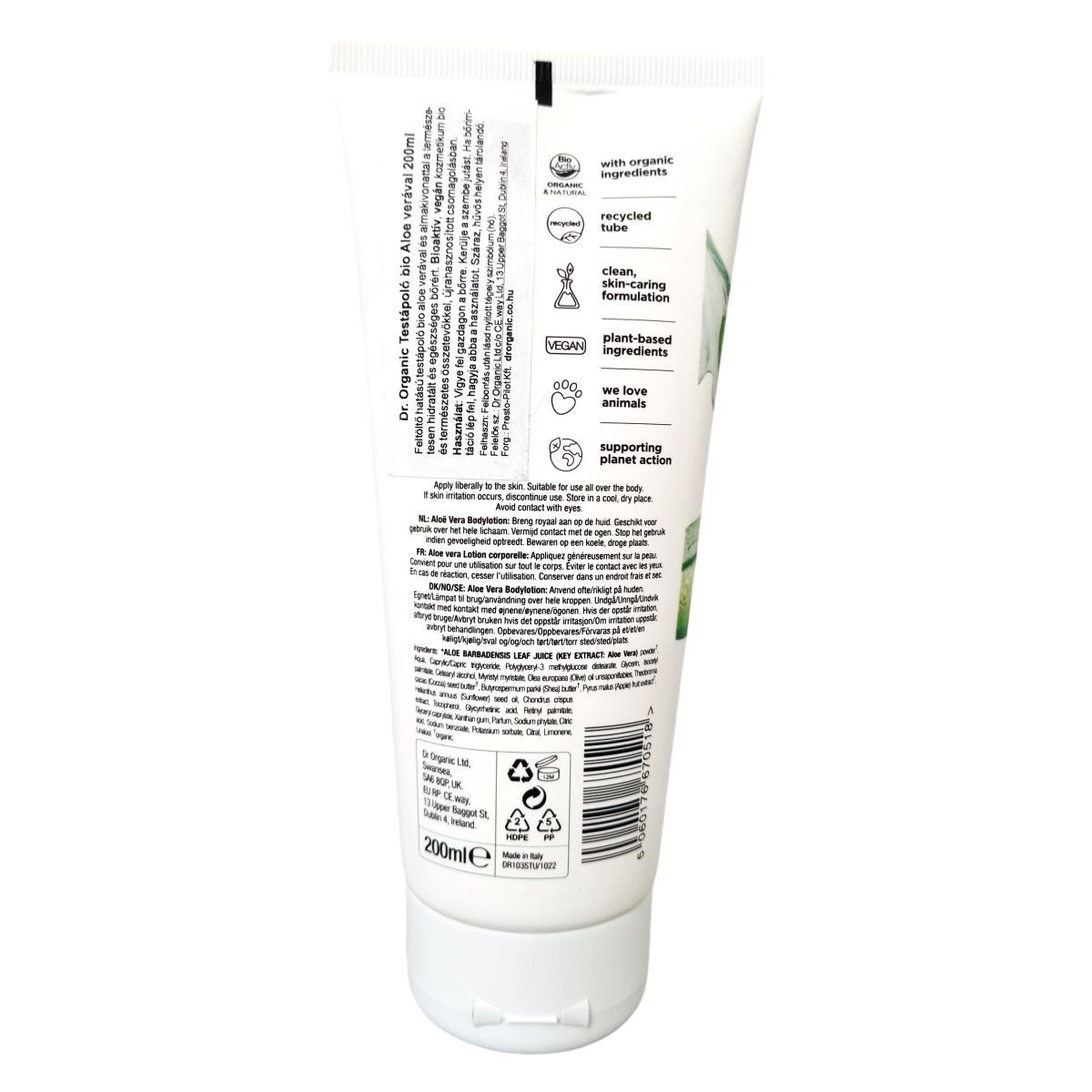 A Dr. Organic Aloe Vera Body Lotion kíméletes testápoló, amely a bio Aloe Vera hidratáló, bőrnyugtató hatását használja fel. Rendszeres használata segíthet a bőr természetes nedvességtartalmának megőrzésében és a külső hatások utáni regenerációban. Gazdag természetes vajakban és növényi olajokban, amelyek puhává és bársonyossá tehetik a bőrt. Vegán, állatkísérlet-mentes és környezetbarát összetétele miatt tökéletes választás a tudatos bőrápoláshoz.