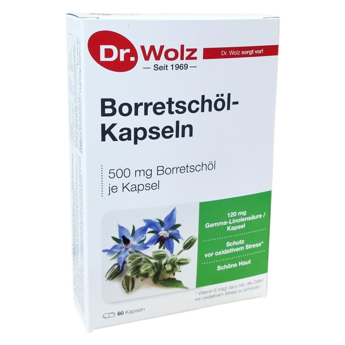 A Dr. Wolz Borretschöl-Kapseln tiszta borrágóolajat tartalmaznak, amely a borrákszemekből készül. Egy kapszula 500 mg borrágóolajat, ebből 120 mg gamma-linolénsavat és 12 mg E-vitamint tartalmaz, mely utóbbi hozzájárulhat a sejtek oxidatív stresszel szembeni védelméhez. A kapszulák glutén-, laktóz-, fruktóz- és színezékmentesek. A termék minőségét a gondos alapanyagválasztás, rendszeres szennyezőanyag-elemzések, tanúsított gyártási folyamat és független kutatóintézetek által végzett hatásvizsgálatok biztosítják. A napi ajánlott fogyasztás 2 kapszula, amelyet étkezéshez javasolt bevenni, egy pohár vízzel. Az étrend-kiegészítő nem helyettesíti a kiegyensúlyozott étrendet és az egészséges életmódot. A termék OETTI engedélyszámmal rendelkezik, továbbá a tárolás +4 °C és +25 °C között javasolt.