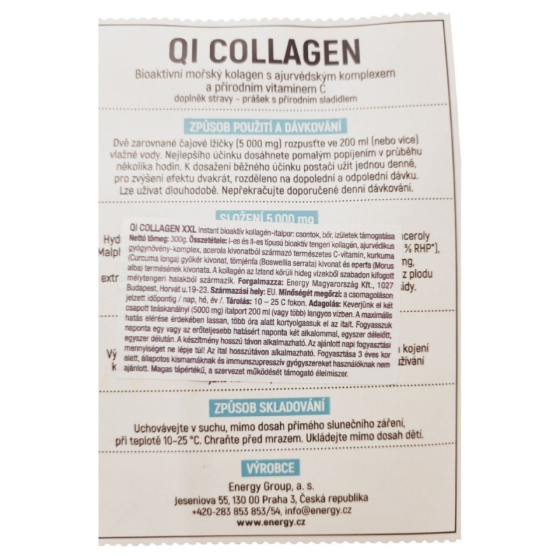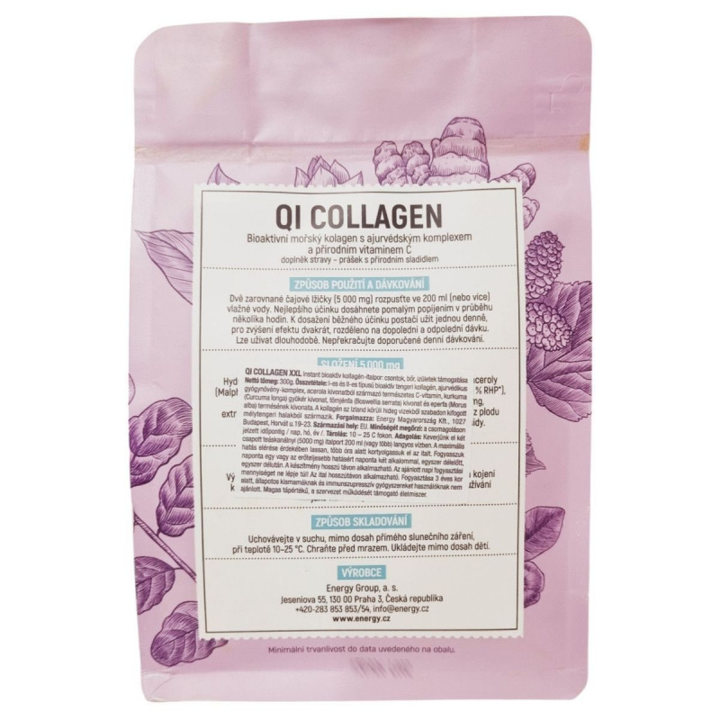 A QI Collegen I-es és II-es típusú bioaktív tengeri halkollagént, ajurvédikus gyógynövény-komplexet, acerolából kivonat természetes C-vitamint, Boswelia serrata-t (tömjénfát) és a Curcuma longa-t (kurkuma) tartalmaz.