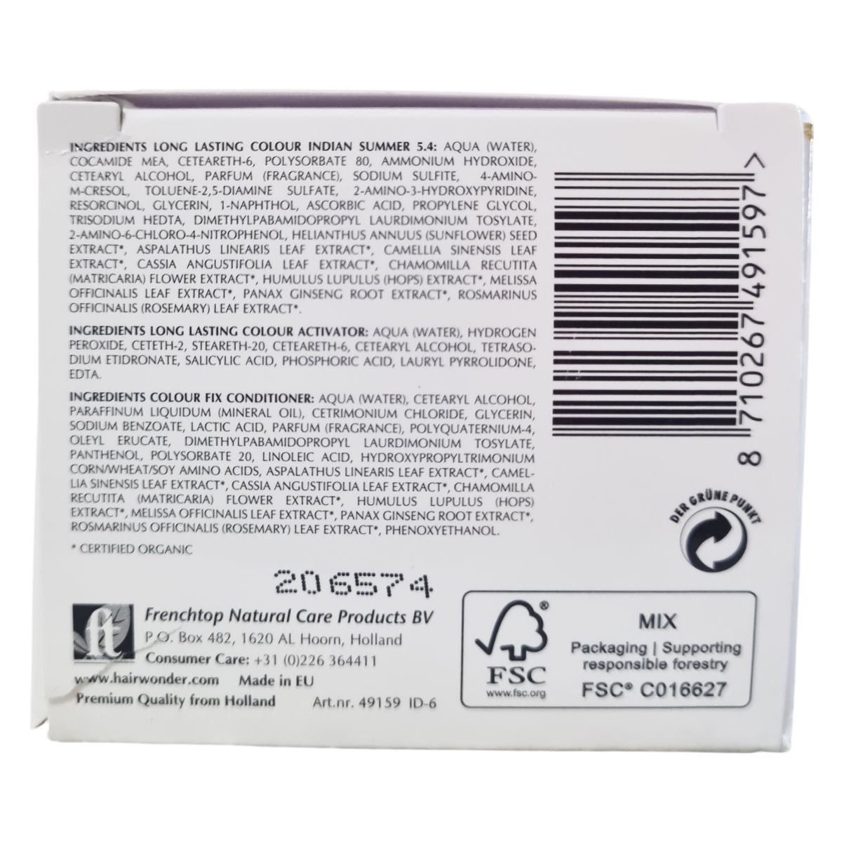 A tartós hajfesték természetes hennakivonattal készült, 2–3 hónapon át tartó színeredményt nyújt. A festék egyszerre színez és ápol, számos növényi kivonatot tartalmaz, mint a henna, martilapi, búzacsíra, napraforgómag és több gyógynövénykivonat. A formula védi a haj szerkezetét, fokozza a fényt, lassítja a szín fakulását és puha, rugalmas hajvégeredményt ad. A termék három részből áll: hajfesték krém, aktivátor és színfixáló kondicionáló. A kondicionáló lezárja a haj kutikuláit és fényes, selymes érzetet ad. A hajfesték 97%-ban természetes összetevőkre épül, és organikus növényi kivonatokkal gazdagított. Hosszú haj esetén két csomag használata ajánlott.