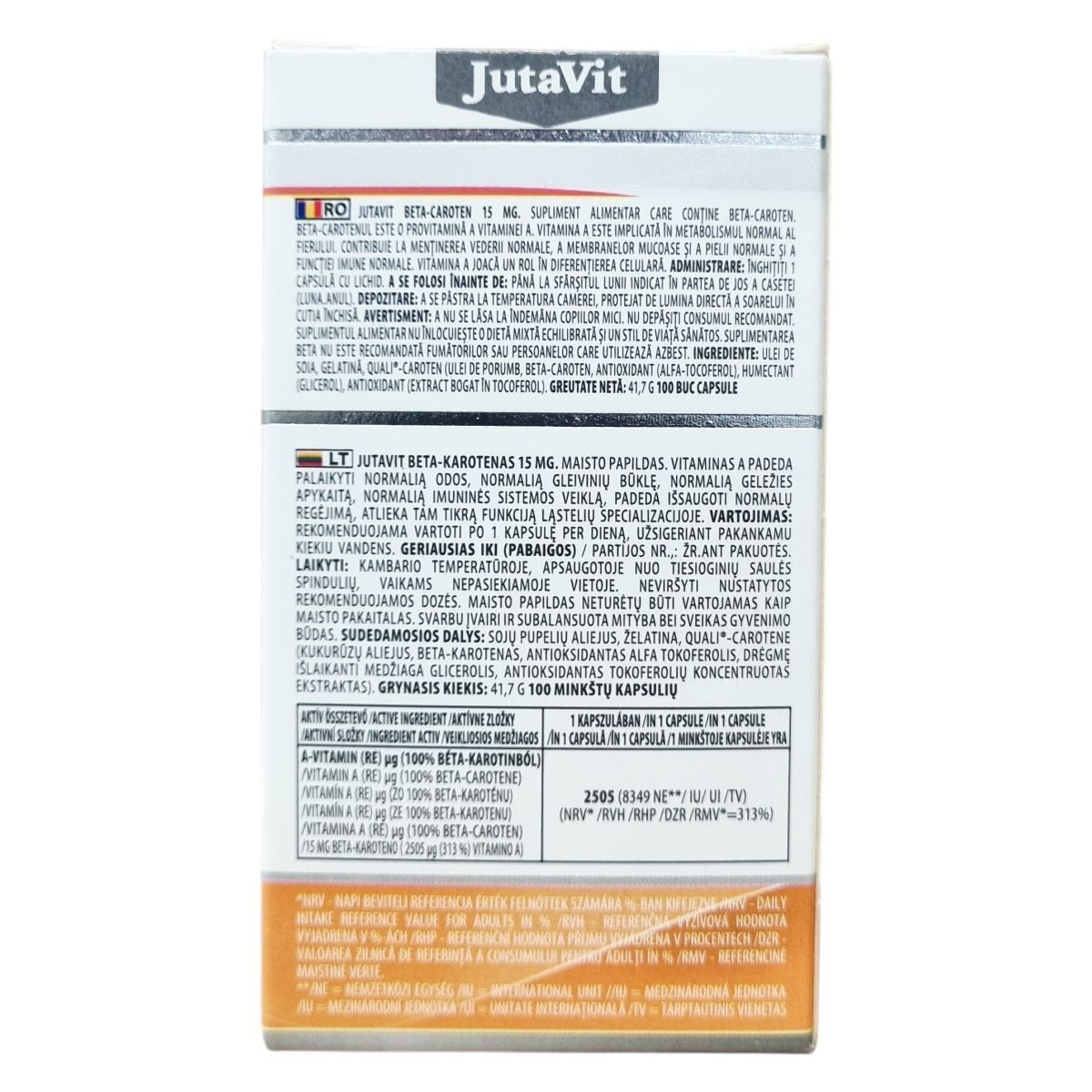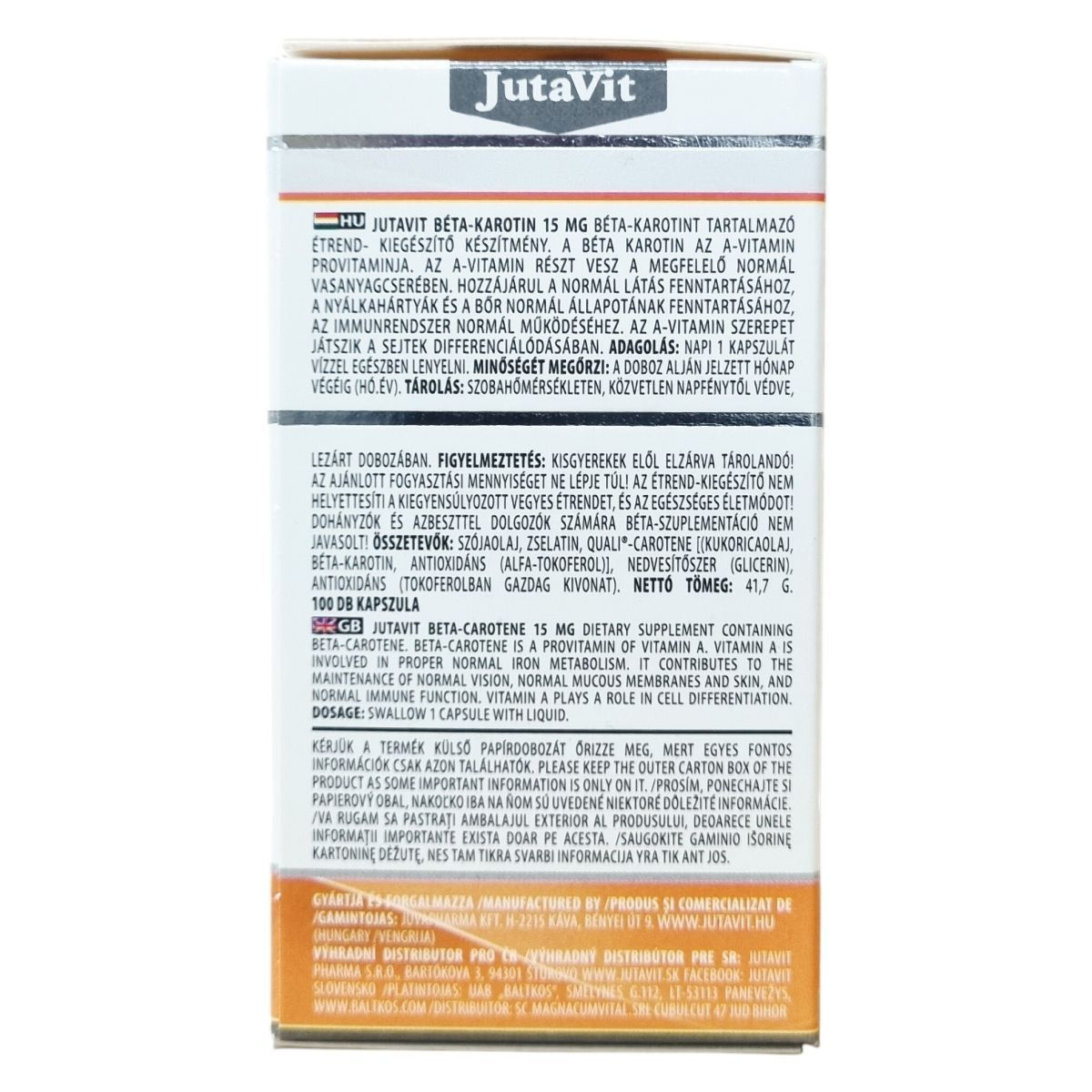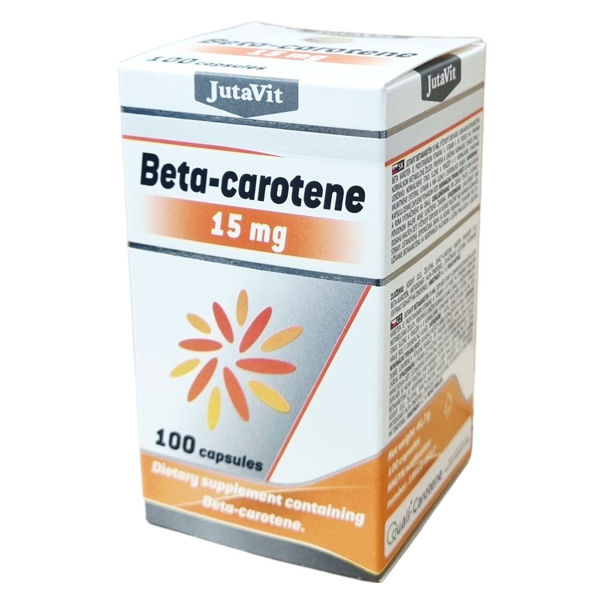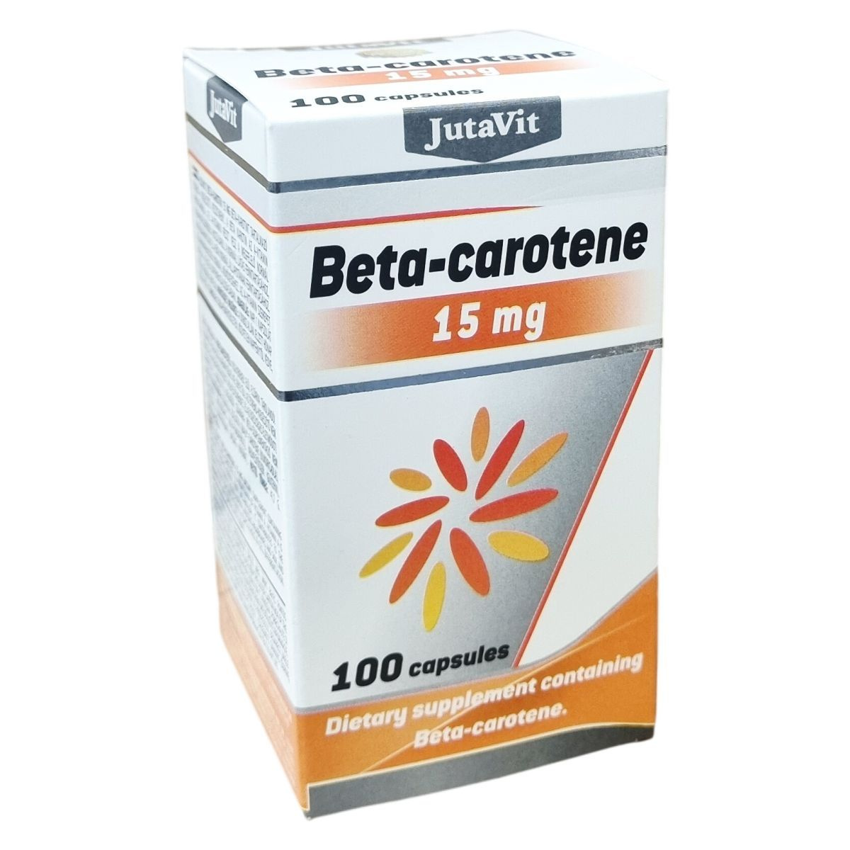 A JutaVit Beta-carotene kapszula 15 mg beta-karotint tartalmaz, amely az A-vitamin provitaminja. Az A-vitamin részt vesz a normál vasanyagcserében, szerepet játszhat a sejtek differenciálódásában, valamint hozzájárulhat a normál látás, a bőr és nyálkahártyák állapotának fenntartásához és az immunrendszer megfelelő működéséhez. A készítmény kizárólag étrend-kiegészítőként szolgál, és nem helyettesítheti a változatos étrendet. Az ajánlott napi mennyiséget nem szabad túllépni. A terméket nem javasolt dohányzóknak és azbesztnek kitett személyeknek fogyasztani. A kapszulák szójaolajat és zselatint tartalmaznak, antioxidánsként alfa-tokoferolt és tokoferolban gazdag kivonatot alkalmaznak. A doboz 100 kapszulát tartalmaz, nettó tömeg 41,7 g. A kapszulát napi egy alkalommal, bő vízzel kell bevenni.