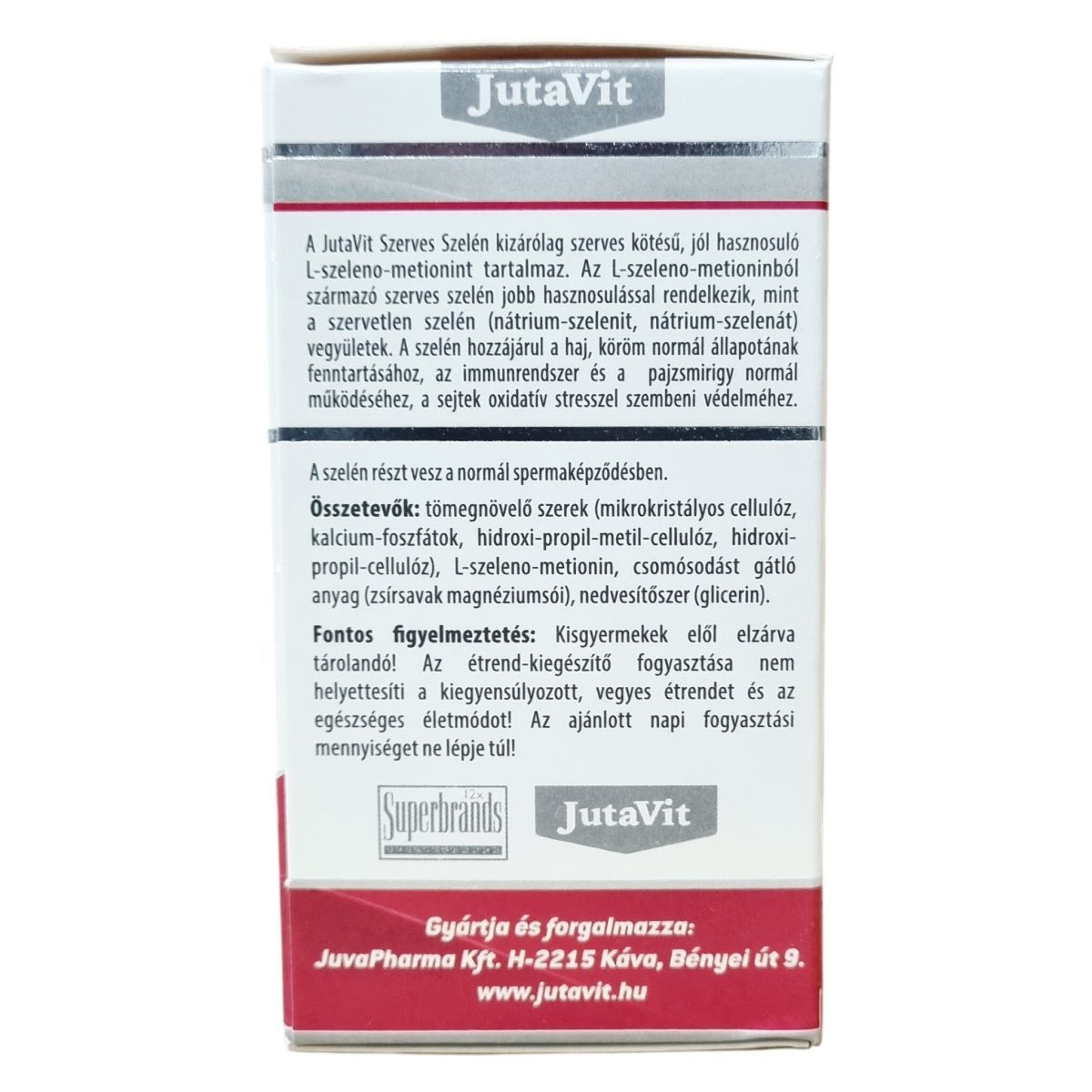 A JutaVit Szerves Szelén kizárólag L-szeleno-metionint tartalmaz, amely szerves kötésű és jól hasznosuló forma. Az ebből származó szelén hatékonyabban hasznosulhat, mint a szervetlen formákból (például nátrium-szelenit, nátrium-szelenát). A termék hozzájárulhat a haj és a köröm normál állapotának fenntartásához, a sejtek oxidatív stresszel szembeni védelméhez, az immunrendszer és a pajzsmirigy normál működéséhez, valamint részt vehet a normál spermaképződésben. A készítmény 100 µg szelént tartalmaz filmtablettánként, amely biztosítja a napi beviteli referenciaérték 182%-át. Az összetevők között szerepelnek különféle tömegnövelő, csomósodást gátló és nedvesítő anyagok, amelyek a tabletta stabilitását és minőségét szolgálják.